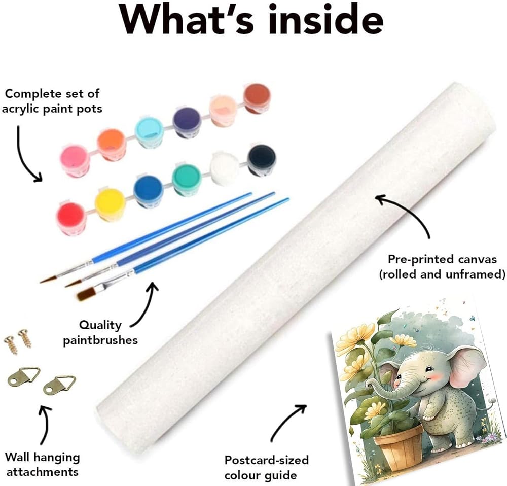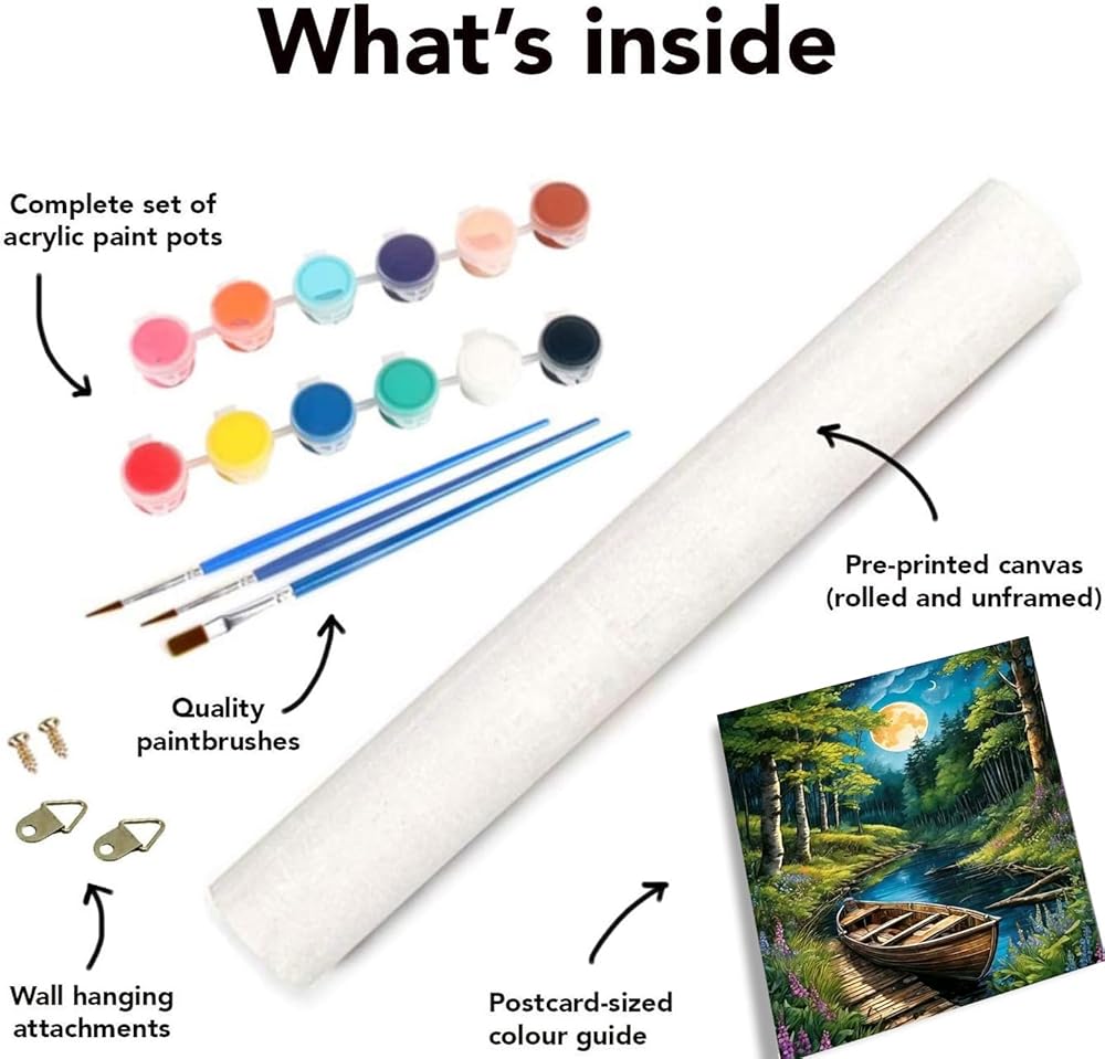 【Superior Quality Components】Our kit includes high-quality brushes of varying sizes, a crisply printed canvas, ample paints, and two hooks for display.