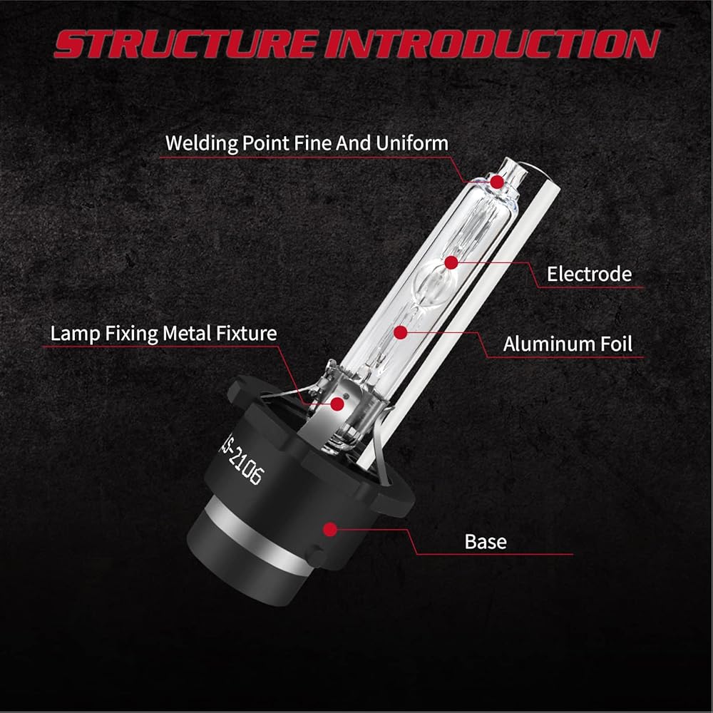 【Safe and Durable】D2S xenon hid headlight bulbs purity up to 99.9%. Quick start in seconds. Anti-ultraviolet quartz glass can prevent mirror cracking and shadow, spraying. Make the lamp more stable, 50000 hours longer service life. Reduce replacement frequency and maintenance cost.