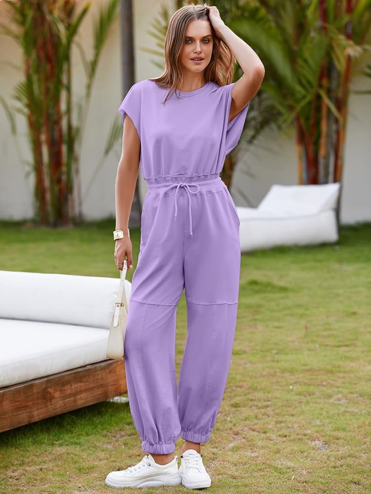 Design Highlights: Simplee women jumpsuit boasts a soft terry cloth fabric, crew neck, short sleeves with a relaxed fit, dropped armholes, cinched waist with adjustable drawstring, large pockets, tapered hem at the bottom, back slit, and snap buttons.