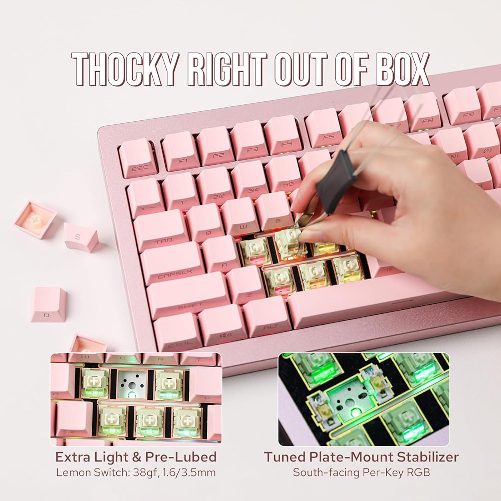 【QMK Programmable Hotswappable PCB】Both the Tide 65 and Tide 75 are QMK compatible, allowing for comprehensive programmability and customization of key mappings and macros to suit any workflow or gaming setup. With a hot-swappable PCBs, users can easily swap to desired switches without any soldering required, maximizing personalization and convenience.