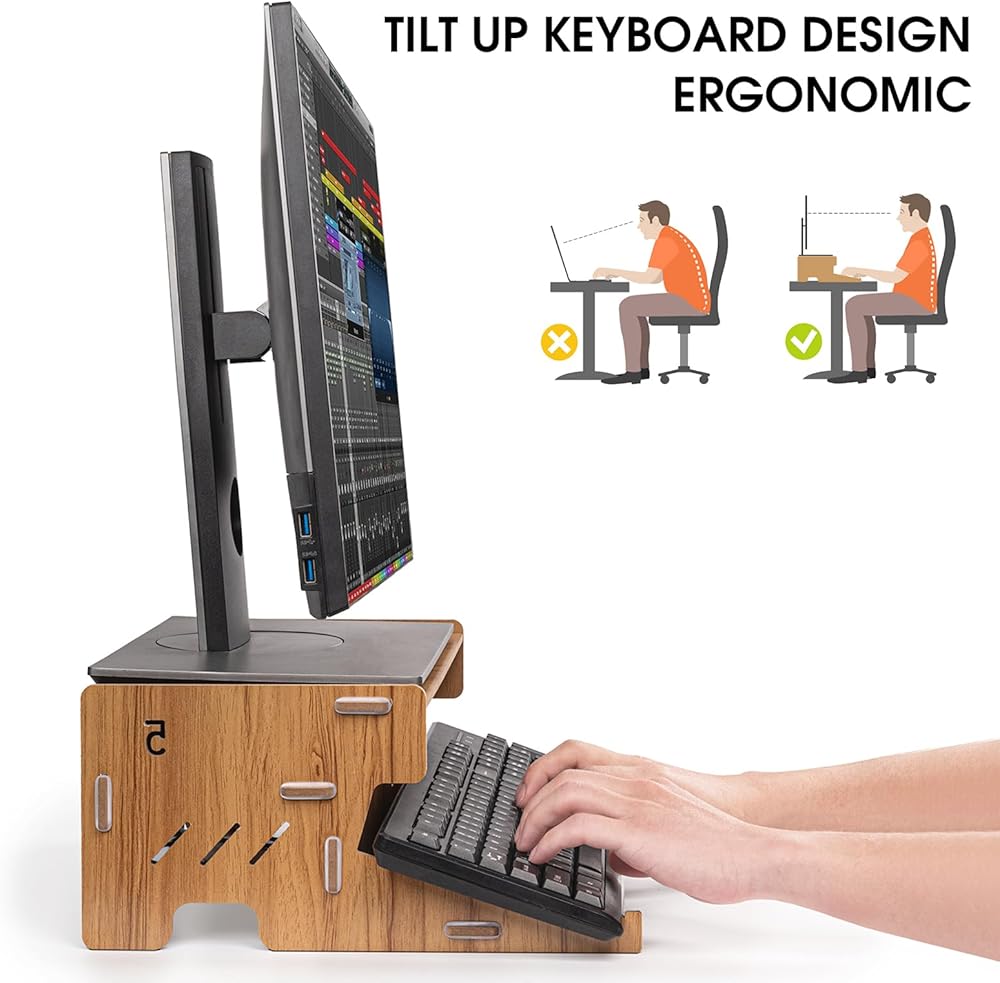 【Tilt keyboard tray】monitor stand is specially designed with a place to store the keyboard a tilt angle. This is a feature that other products on the market do not have. It can relieve wrist pain and reduce stress while typing. Please note that the keyboard size must exceed 13.7 inches to support it. Please confirm the size of the keyboard when purchasing.