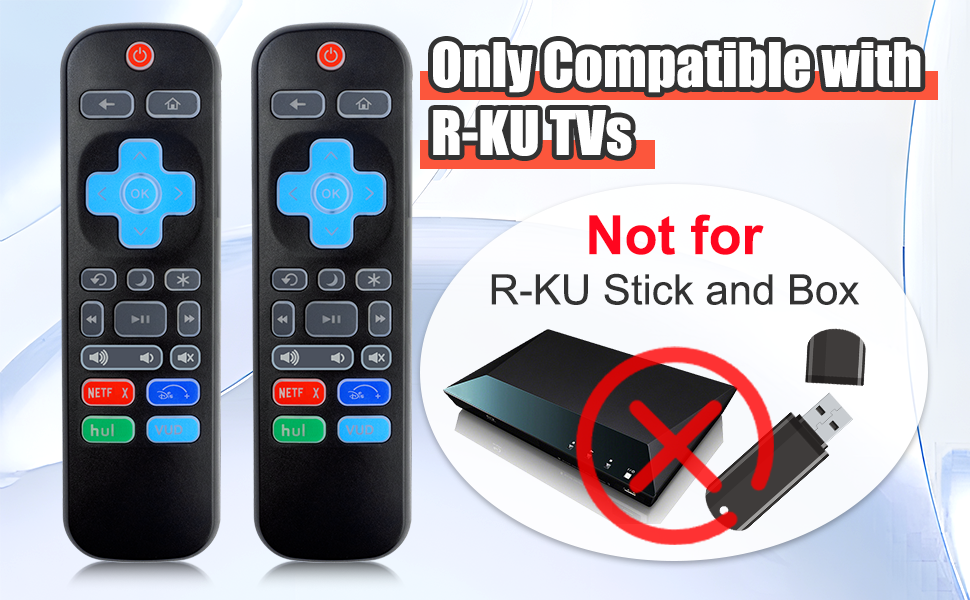 【Not Applicable】The Remote is NOT compatible with Roku Stick, not for Roku Streaming Stick, not for Roku Box 1/2/3/4(HD/LT/XS/XD), not for Roku Ultra, not for Roku Express, not for Roku Premiere or not for Roku Player.