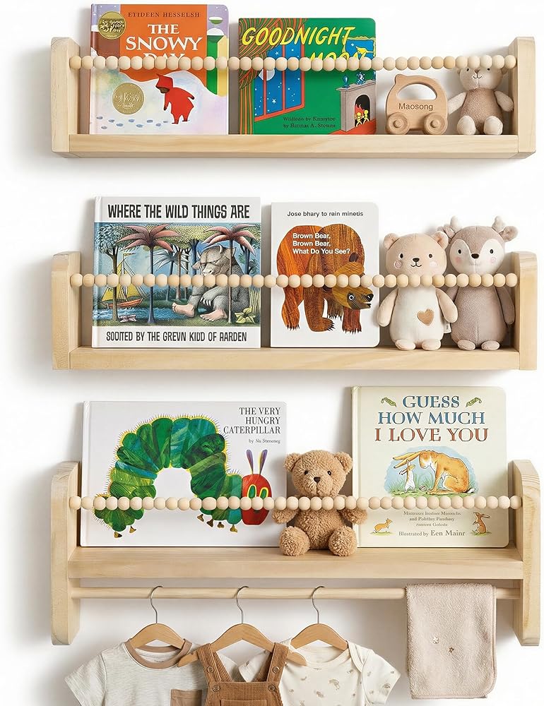 【Safe Protective Design】Nursery book shelves feature a charming wooden bead fence design that prevents items from falling, making them ideal for children's rooms. The edges are designed with circular arcs to avoid collisions and provide additional protection for children