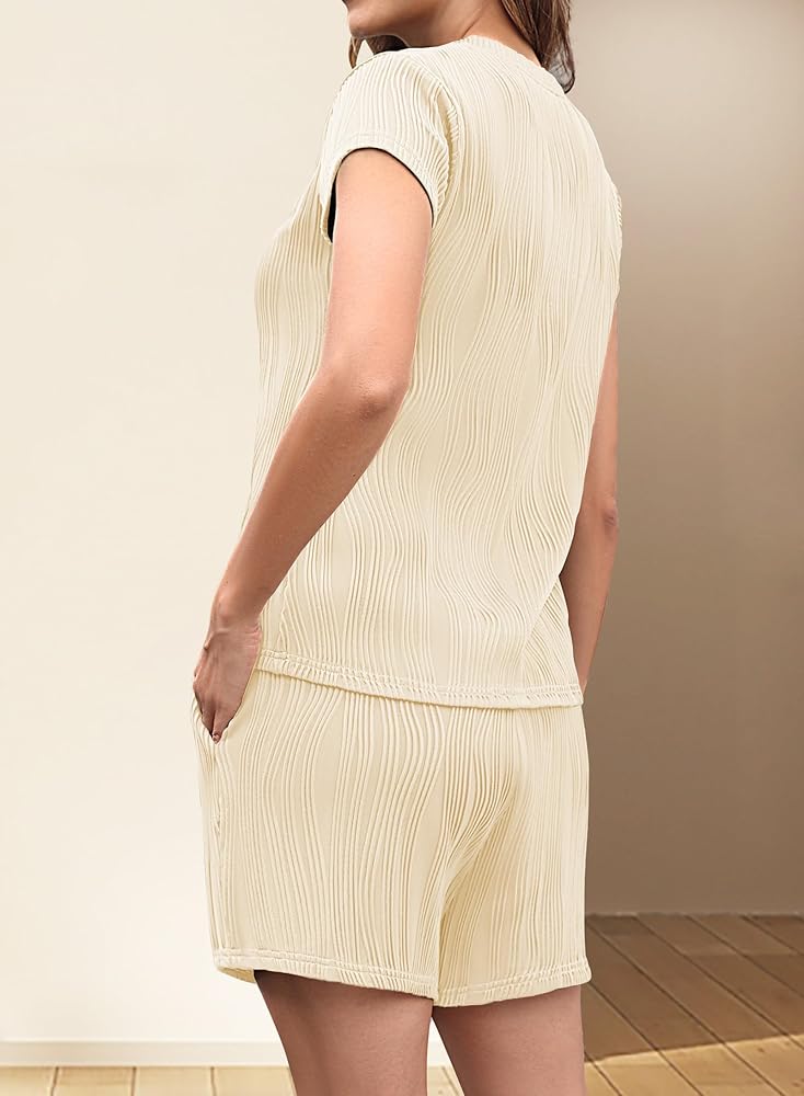 【Trendy Design】Womens textured sets 2 piece outfits. Unique Textured Material Adds Visual Interest To The Dressy Tops For Women. Tee Shirts Designed With Classic Round Neck And Fashion Drop Shoulder, Providing A Versatile Option For Everyday Wear. While the wide-leg design of the shorts pants enhances the relaxed and carefree nature of this set. It offers a loose, flowing silhouette that provides freedom of movement and a comfortable wearing experience.