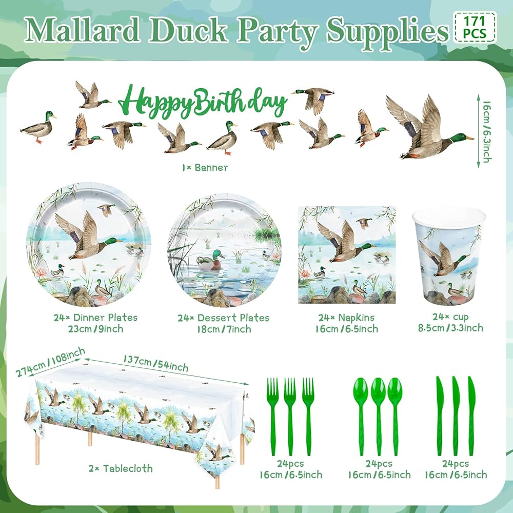 171pcs Mallard Duck Party Supplies Mallard Duck Party Plates Napkins Tableware Set Disposable Paper Cups Green Forks Tablecloth and Banner Duck Hunting Birthday Party Decorations Serves 24