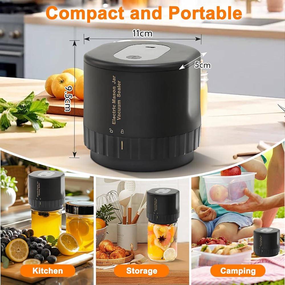 Portable and Compact Can Sealer: Compact design saves kitchen space and is perfect for travel and picnics. our electric mason jar vacuum sealer extends freshness and reduces food waste. upgrade high- performance motor, powerful suction, addresses the issue of not having enough suction power to handle large bottle caps.
