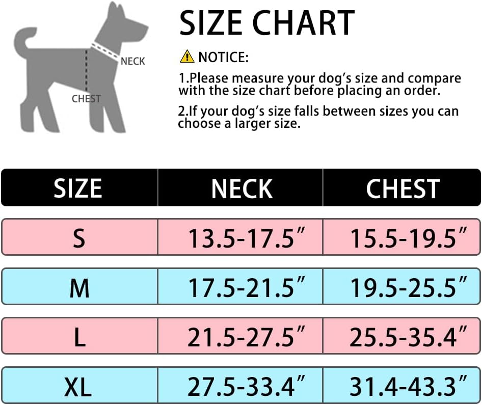 To better fit your dog Please measure your dog's size and compare with our size chart before ordering. If you have any questions about our dog harnesses, Please contact us in time, we will solve your problems within 24 hours.Hope you have a great walking with your furry friend!