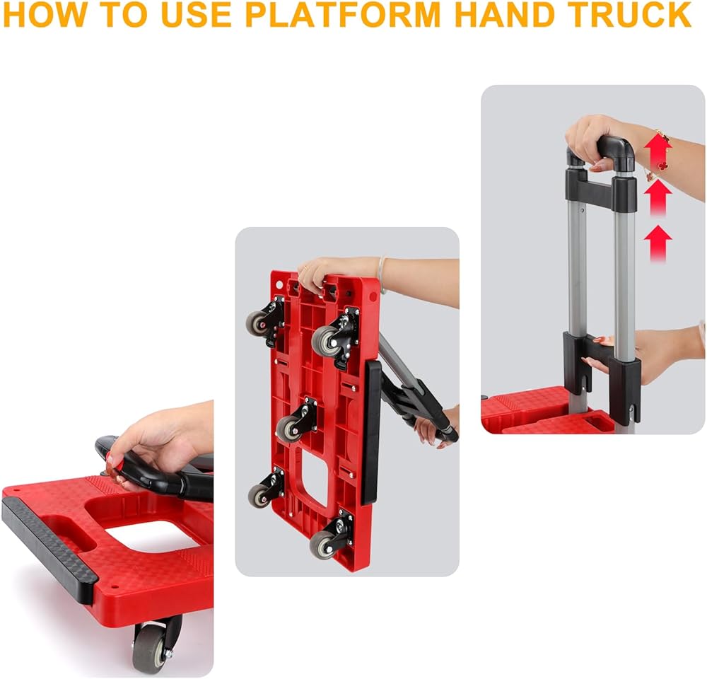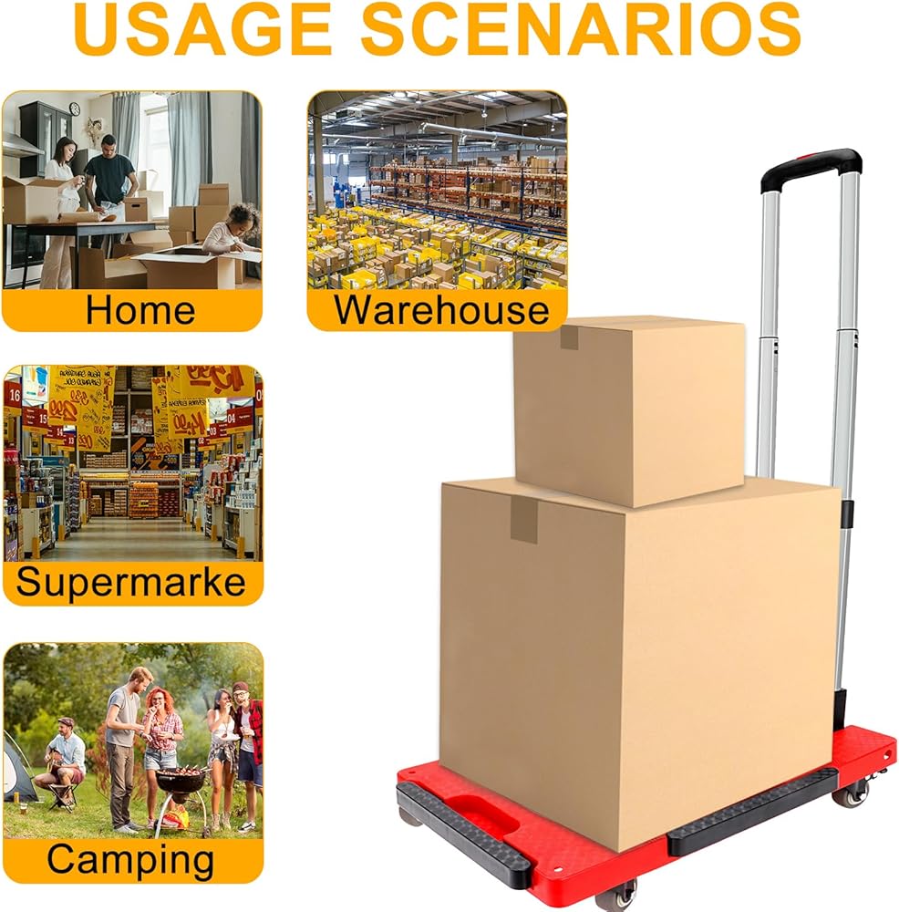 Folding together to pull the car, innovative braking function, extended and widened chassis, aluminum pull rod universal handcart, good handling assistant Silent and wear-resistant, you need such a powerful tool for shopping, moving, and traveling Durable, push and pull, shockproof and anti slip, silent and wear-resistant, with a sturdy structure Five core upgrades for aluminum alloy trolley cars Advantages Analysis Core 1: Push-pull dual use, with a 90 degree angle for fixed pull rods, and push-pull dual use. Core 2: Uniform force, TPR silent rubber wheel with five wheels for more uniform force, three universal wheels for flexible rotation, and two fixed wheels for stable direction. Core 3: Strong load-bearing capacity, with three sides that can be stretched, extended, and widened, resulting in stronger and more stable load-bearing capacity. Core 4: Small and lightweight, with a foldable design that is lightweight and does not take up space for placement. Easy to carry and store, with a net weight of only 5.5LB. Core 5: Rubber wheels, independently developed and produced, with ultra-low frequency, labor-saving, and wear-resistant features. Good car matching with wheels. Product Material: Aluminum alloy tube, PP middle bracket, ABS hook, PP plastic bottom plate rubber wear-resistant silent wheel, ABS handle.