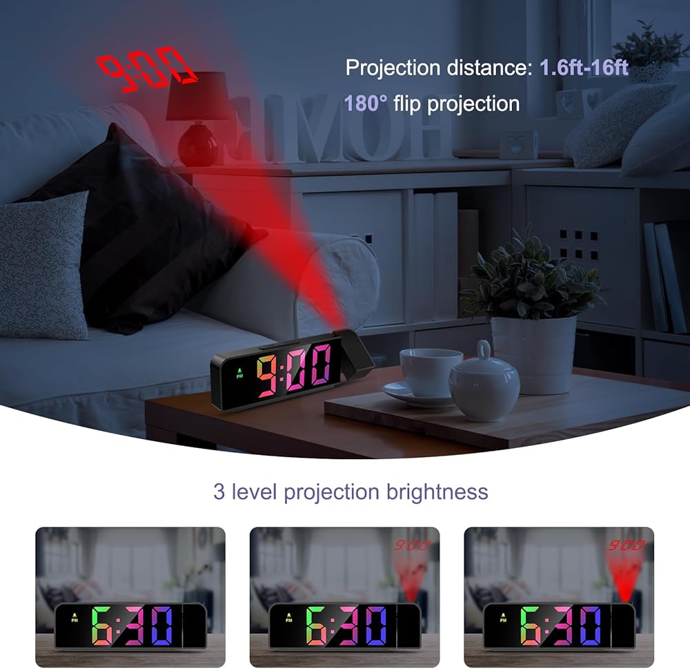 ⏰【Ultra Clear Projection】- The projection clock has a ultra clear projection that projects time onto the ceiling or wall from 1.6 to 16 feet (0.5 to 5 metres) with 3 adjustable projection brightness levels. The time can easily be read on the wall or ceiling while lying in bed. 💝𝗧𝗵𝗲 𝗽𝗿𝗼𝗷𝗲𝗰𝘁𝗼𝗿 𝗰𝗹𝗼𝗰𝗸 𝗰𝗮𝗻 𝗼𝗻𝗹𝘆 𝗯𝗲 𝗽𝗿𝗼𝗷𝗲𝗰𝘁𝗲𝗱 𝘁𝗼𝘄𝗮𝗿𝗱𝘀 𝘁𝗵𝗲 𝗯𝗮𝗰𝗸 𝗼𝗳 𝘁𝗵𝗲 𝗰𝗹𝗼𝗰𝗸, 𝗶𝗳 𝗳𝗼𝗿𝘄𝗮𝗿𝗱, 𝘁𝗵𝗲 𝗻𝘂𝗺𝗯𝗲𝗿 𝘄𝗶𝗹𝗹 𝗯𝗲 𝘂𝗽𝘀𝗶𝗱𝗲 𝗱𝗼𝘄𝗻.
