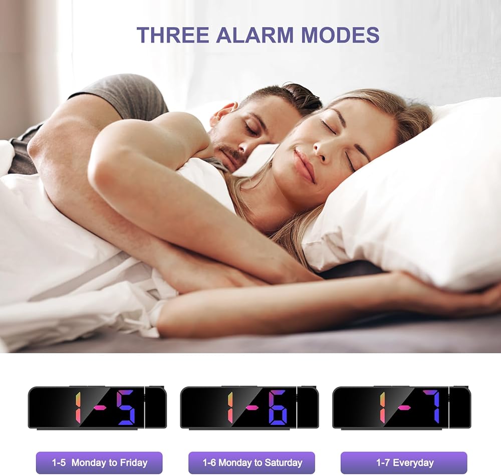 ⏰【Weekday Mode & Snooze】- There are 3 alarm modes to choose from: Monday to Friday/Monday to Saturday/Monday to Sunday. The weekday mode allows you to not have to be woken up on the weekend. If you are too sleepy to wake up when the alarm goes off, simply press the big "Snooze" button at the top to get an extra 5 minutes (default) of sleep. (Snooze time can be set within 1-60 minutes).