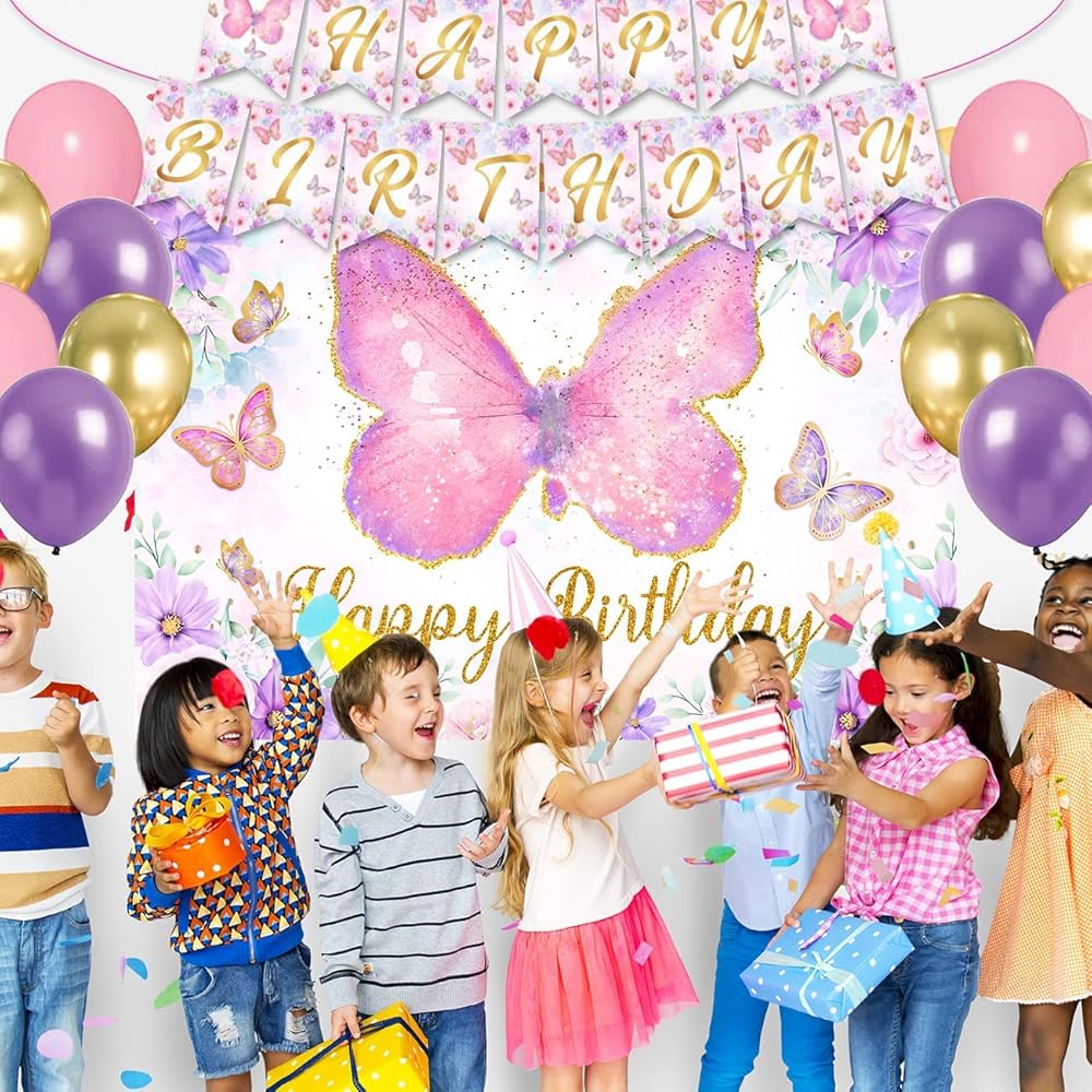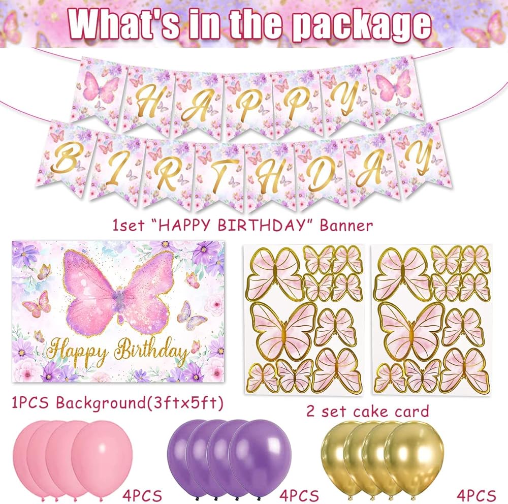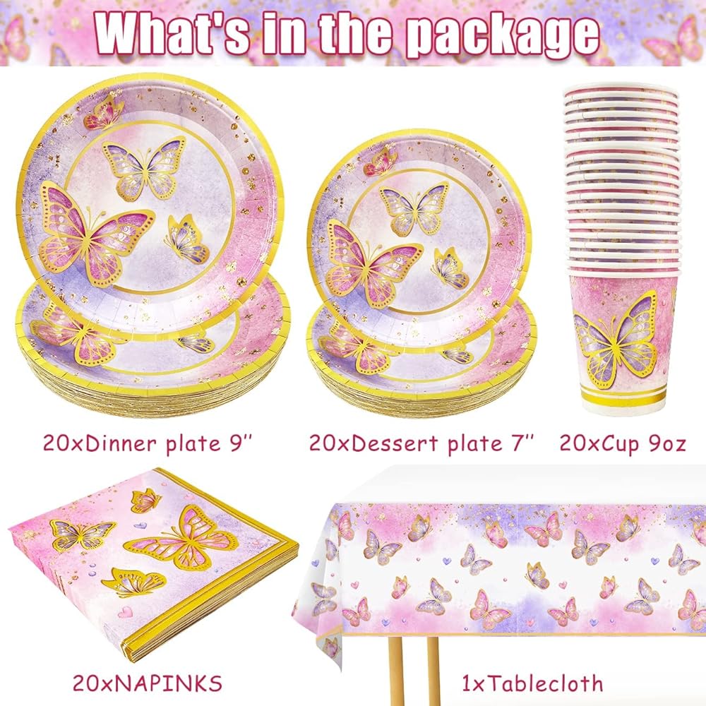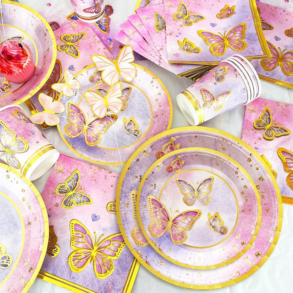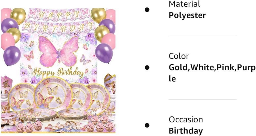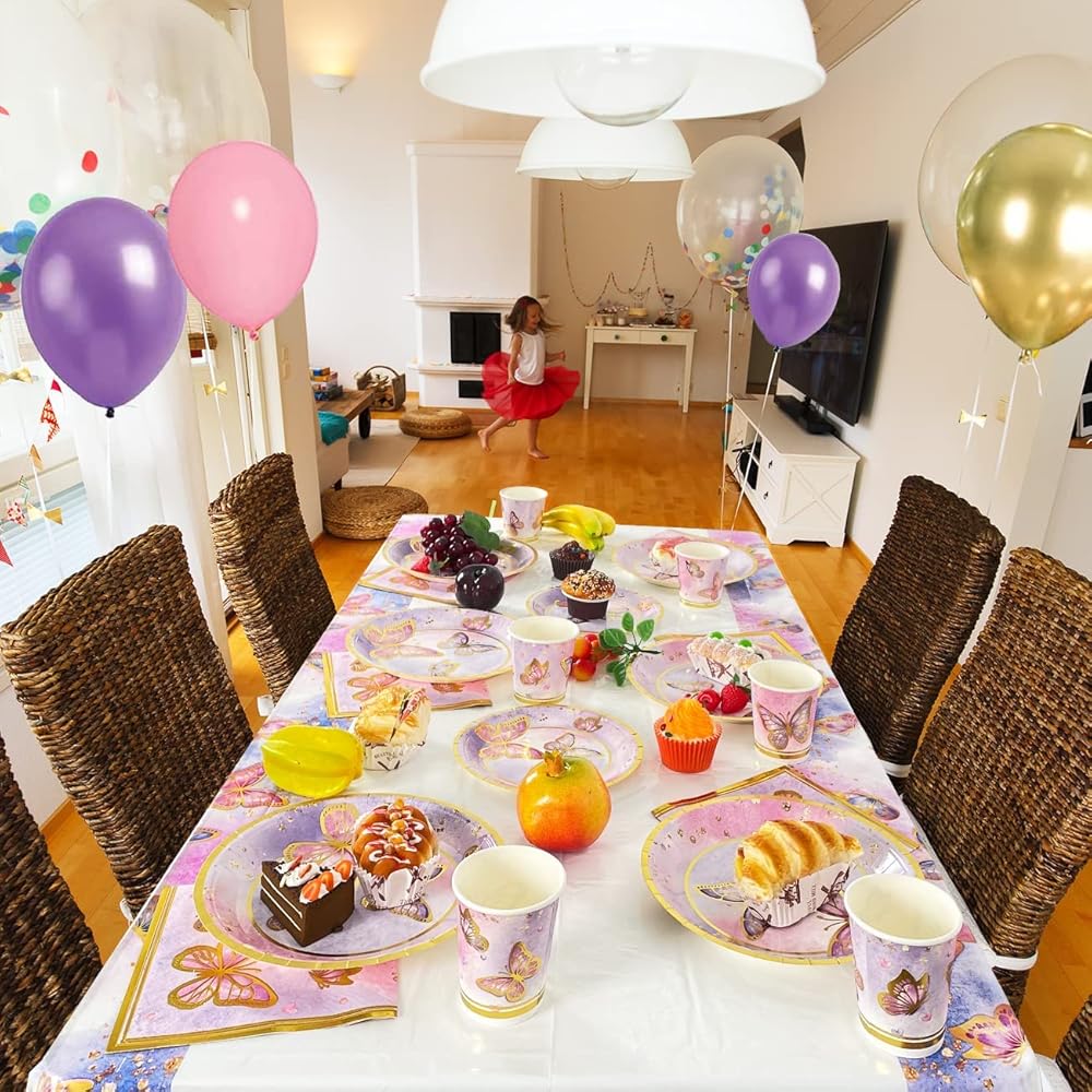 【Beautifully Designed】 Our dinner plates、dessert plates、cups, napkins and tablecloth Printed pink, purple and golden butterfly, Lifelike. The butterfly tablecloths are exquisitely designed, The combination of purple, pink and gold is very elegant.which are printed with gold letter happy birthday, purple flowers and pink butterfly elements on the white backdrop and banner.Three color balloons and Butterfly Wall Decor, well set off the atmosphere and better decorate your scene.