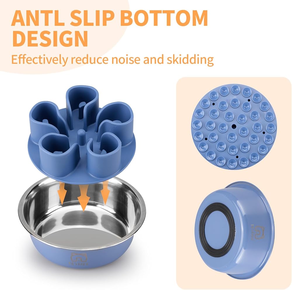 ✓ NON-SLIP BOTTOM DESIGN: Our stainless steel dog bowl and slow feeder insert come with a non-slip silicone base that keeps the bowl in place, prevents spills, and protects your floors from scratches and damage. It's also noiseless and helps maintain a clean feeding area.