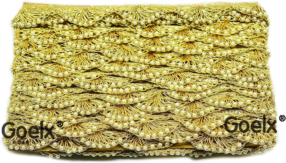 MATERIAL : Zari Pankh Lace with Pearl Moti Beads, COLOR : Mustard Gold With Gold, PACK INCLUDES : 9 Mtr Lace