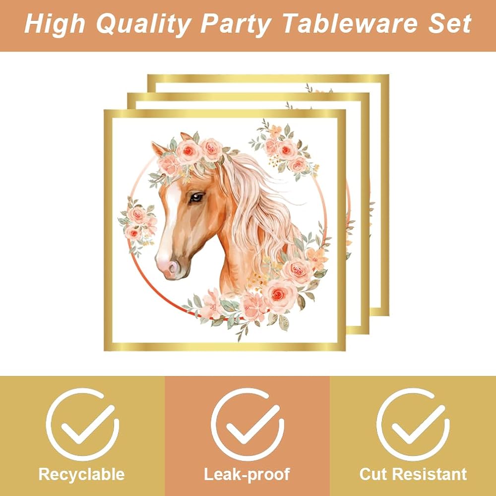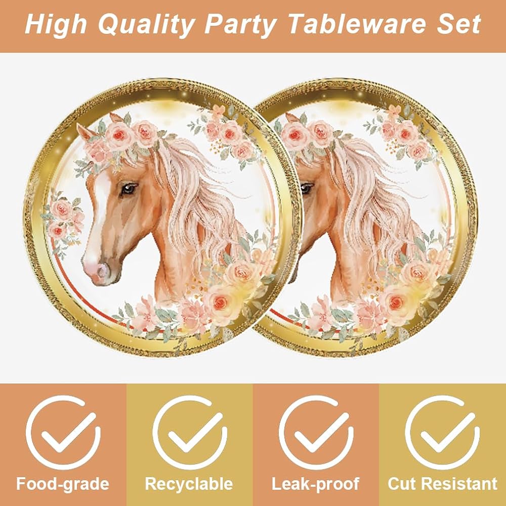 The package includes: 20pcs White and gold horse birthday dessert plate (7") 20pcs White and gold horse birthday napkins (6.5")