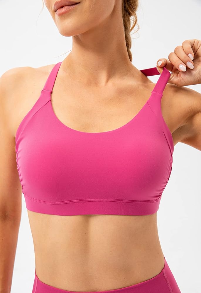 Features: Scoop neckline, elastic crisscross back straps & banded hem, ruched details, removable pads