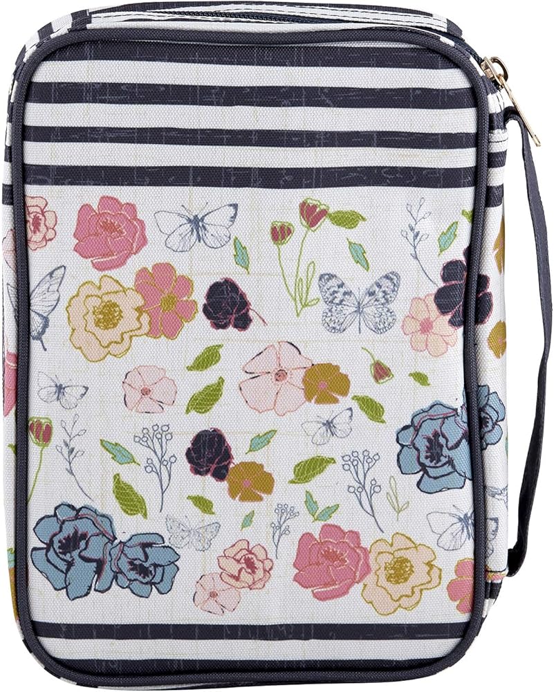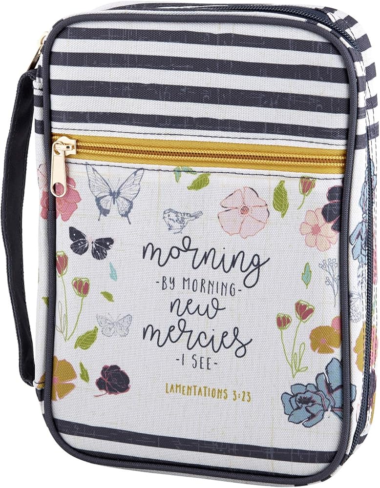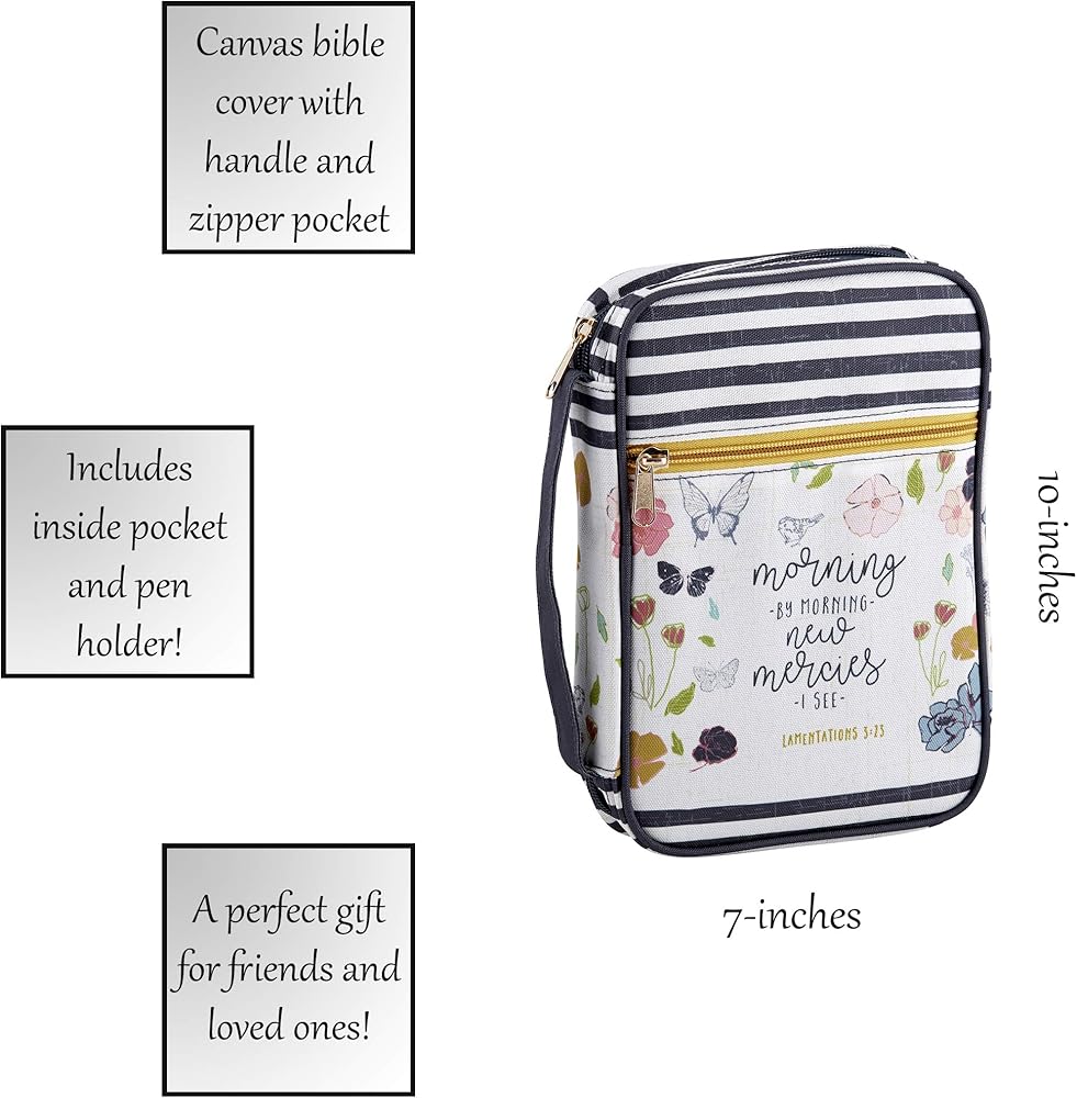 Pretty, white canvas bible cover with flowers and butterflies on the front and back, complemented by contrasting black and white stripes with yellow accents. Scripture verse reads: Morning by morning new mercies I see - Lamentations 3:23. Cover includes a carry handle, front zippered front pocket, inside zippered mesh pocket, ribbon book mark, 2 pen holders and a full length zipper to keep all this secure! Measuring 7 x 10 x 2.5-inches, it is designed to hold a standard sized bible. Combine with a coordinating tote from the Praful Wings collection as a gift for church members, bible study friends and more. Look for gifts and décor for every day and every occasion that encourage, resonate with and uplift the soul from Faithworks at Creative Brands. Creative Brands focuses on gifts that will be a source of inspiration, fun, and encouragement to all with an emphasis on quality, whether for special occasions, social expression, or just for fun.