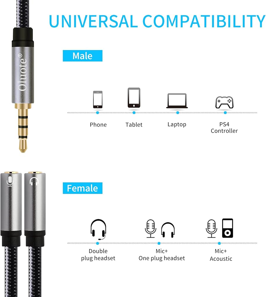Oluote Headset Splitter Headphone Mic Y Adapter Cable,TRRS Male to 2 TRS Female Microphone and Headphone Cable, Compatible for PS4 Xbox Laptop PC Smartphone etc (32.8FT)
