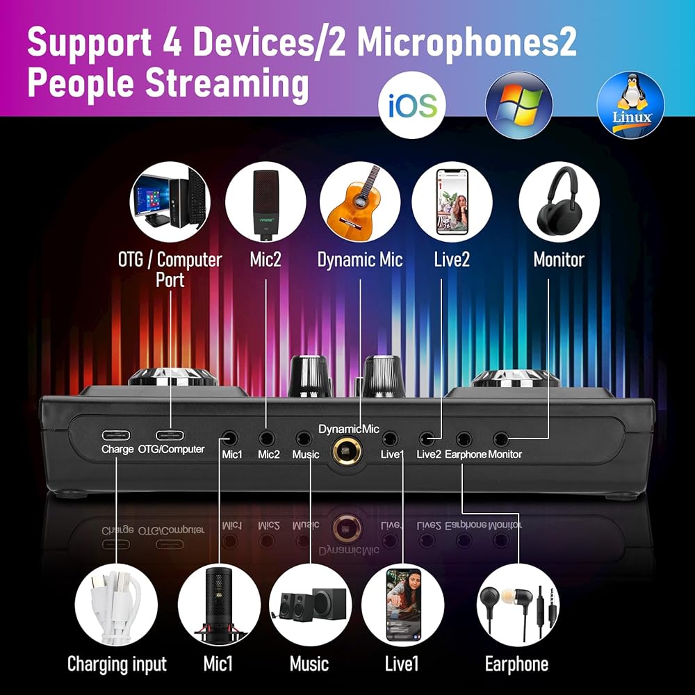 【معدات بودكاست لدعم الأجهزة المتعددة】متوافقة مع الهاتف الخلوي المزدوج المباشر، والهاتف المحمول المتزامن للكمبيوتر، والكمبيوتر المباشر المباشر، والهاتف الخلوي المرافق للكمبيوتر، والهاتف الخلوي لإدخال الأداة مباشرة. يدعم ميكروفونين متصلين في نفس الوقت، ويمكن تعديل درجة الصوت العالية والصوت العالي والصوت المنخفض بشكل مستقل. يمكن أن تكون حزمة معدات البودكاست متوافقة مع أجهزة الكمبيوتر الشخصية والكمبيوتر اللوحي وPS4 وXbox وSwitch وIOS وAndroid وWindows والآلات الموسيقية الإلكترونية.