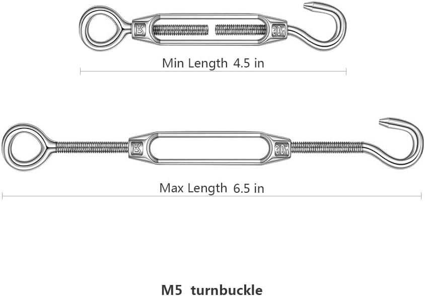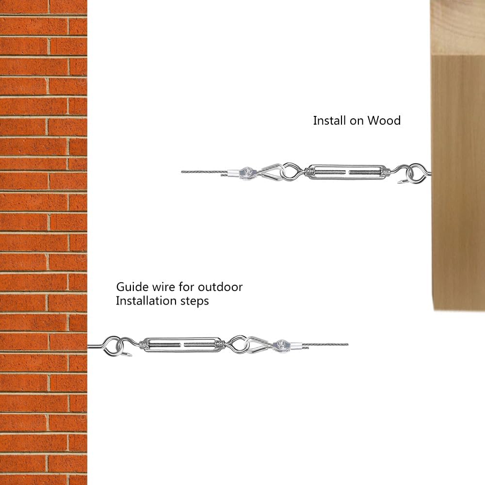 [ Product Feature]Stainless Steel Wire Rope Kit:Stainless Steel Metal Wire OD :1.5mm, 1/8”Coated Wire OD :2.0mm , 7X7 Construction,Can Be Easily Trimmed To Any Desired Length. M5 Turn Buckle Tension Has Advantage Of Adjustable Length 4.5inch-6.5inch ,Once The Cable Is Taut,The Accompanying Guide Rope Ensures That Your Outdoor String Lights Have Strong, Stable Support To Prevent Sagging Or Sagging String Lights, Even In Windy Conditions.
