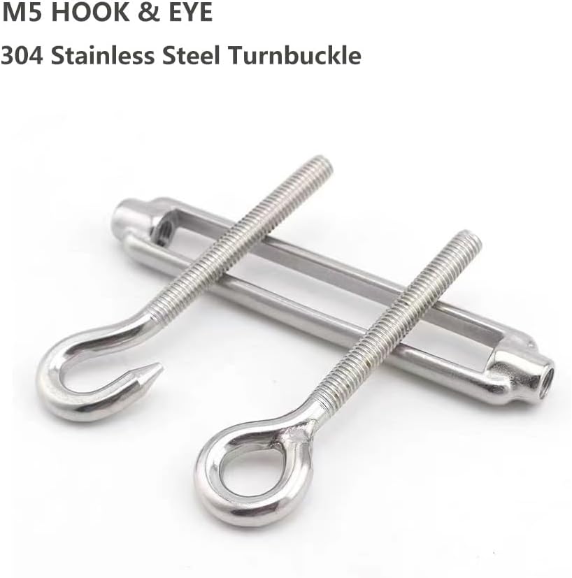 [Easy Installation] : Easy Installation And Disassembly Of Wire Rope And Turn Buckle Assembly. First, Determine The Position And Tighten The Eye Hook; Then, The Steel Cable And The Thimble Through The Eye Hook Or Rotary Buttonhole, Crimping Sleeve Requires Crimping Tools To Tighten The Line; Finally, The M5 Stainless Steel Turnbuckles And Eyes Adjust The Length You Want, Then Make Sure They Stay Securely Tensioned And In Place