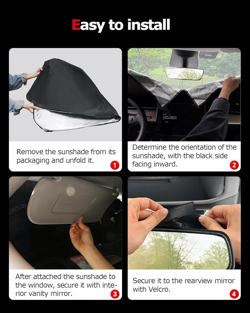 EASE OF USE: Unfold and place it inside the windshield, reflective side out. Adjust to cover the windshield completely, and then tuck under the sun visors. The sunshade is foldable and easy to roll up for storage when not in use.
