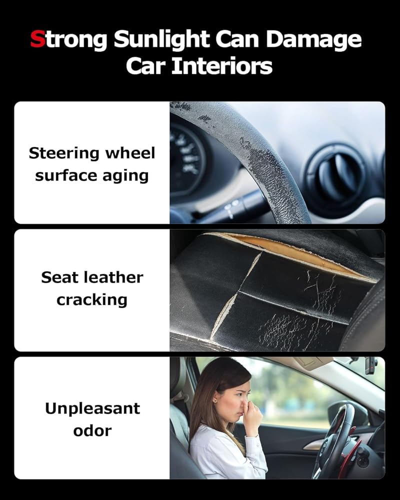 EFFECTIVELY BLOCKS UV RAYS: ASZSK's car sunshade, made of double-layer blackout fabric, effectively protects the car's interior from the harmful effects of UV rays that can cause the dashboard, steering wheel, and upholstery to fade and crack over time.