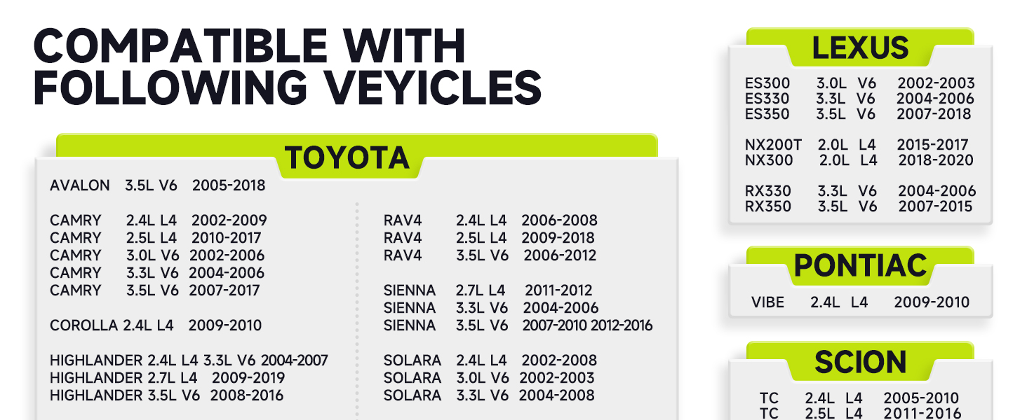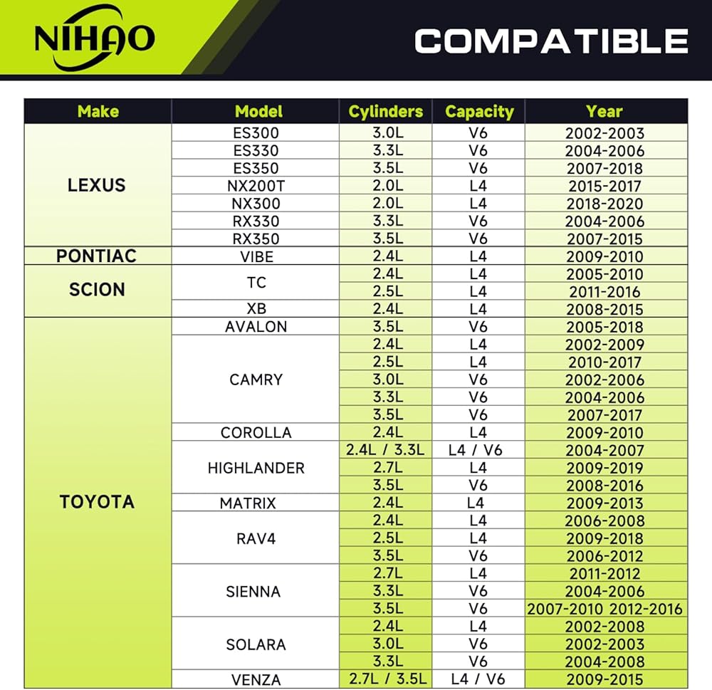 🚗Compatible with TOYOTA:Avalon 3.5L V6 (05-18),Camry 2.4L L4 (02-09),Camry 2.5L L4 (10-17),Camry 3.0L V6 (02-06),Camry 3.3L V6 (04-06),Camry 3.5L V6 (07-17),Corolla 2.4L L4 (09-10),Highlander 2.4L L4 3.3L V6 (04-07),Highlander 2.7L L4 (09-19),Highlander 3.5L V6 (08-16),Matrix 2.4L L4 (09-13),Rav4 2.4L L4 (06-08),Rav4 2.5L L4 (09-18),Rav44 3.5L V6 (06-12),Sienna 2.7L L4 (11-12),Sienna 3.3L V6 (04-06),Sienna 3.5L V6 (07-10 12-16),Solara 2.4L L4 (02-08),Solara 3.0L V6 (02-03),Solara 3.3L V6 (04-08),Venza 2.7L L4 3.5L V6 (09-15).