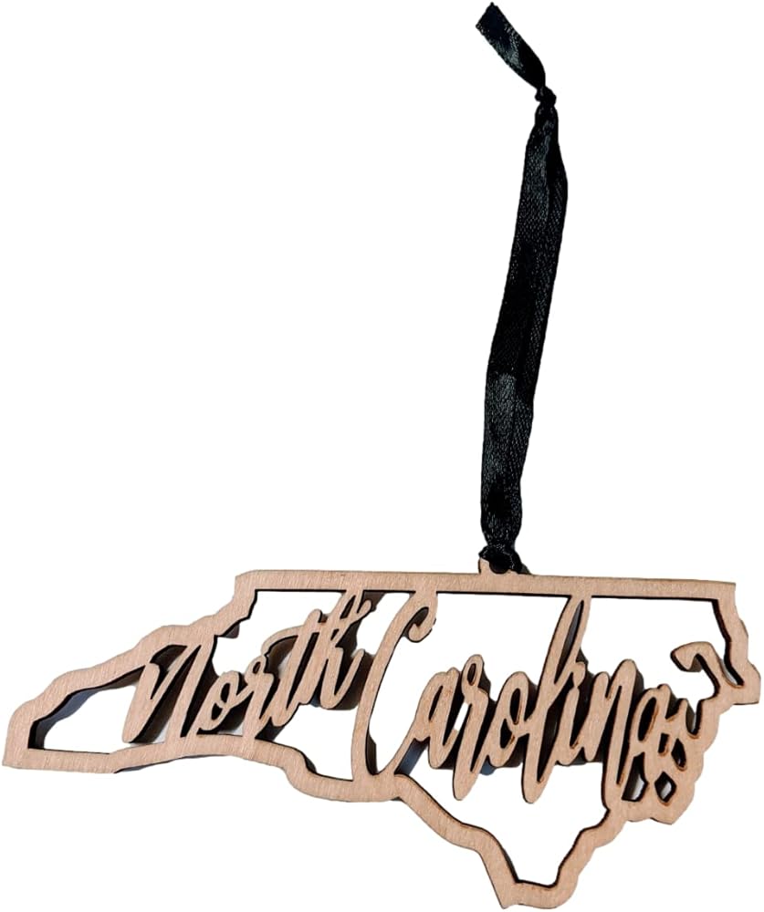North Carolina Christmas Ornament. A modern twist on the typical state shape! Ornament your tree this year to achieve a rustic Christmas look. Made from laser cut wood and black ribbon, Measures 5" l x 2.5" h x 0.25-inch depth.