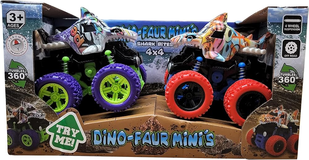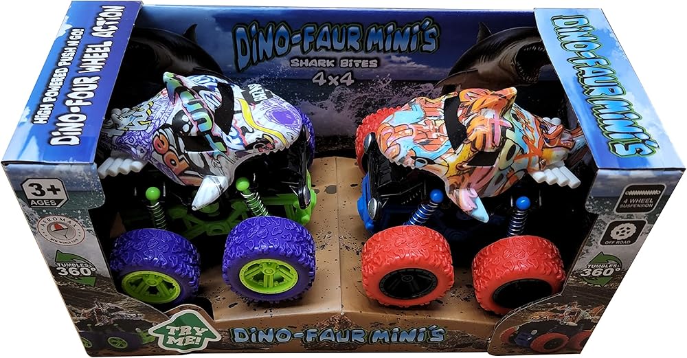 INCLUDES one dinosaur truck with amazing pull back action. Works on carpet too. Size: 7" L x 4. 5" H x 4"w