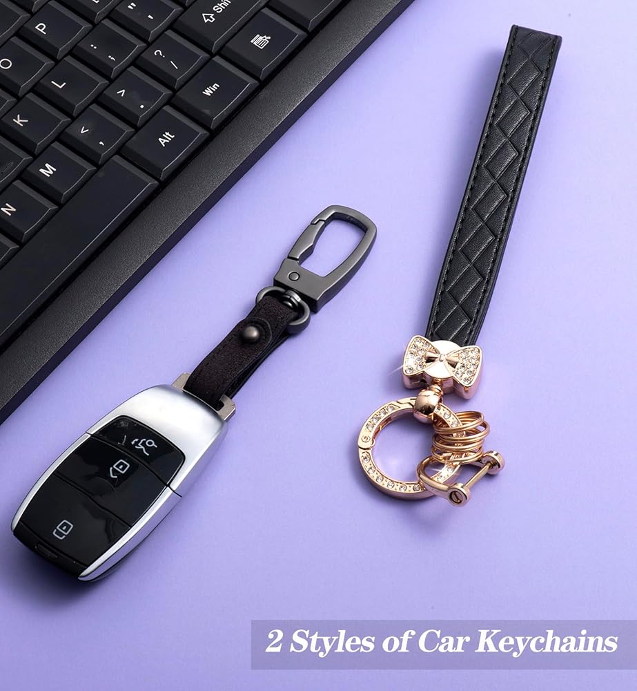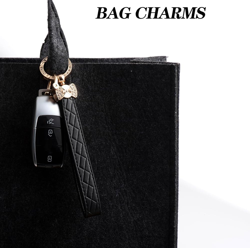 MATERIAL: The car keys keychain is made of durable leather and rust-resistant zinc alloy. Leather wrist strap feels soft, metal clasp is durable and antioxidant resistant, bling crystal diamonds,will not easily chip off and will maintain its luster for a long time.