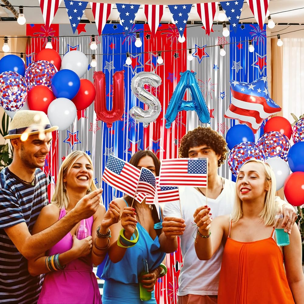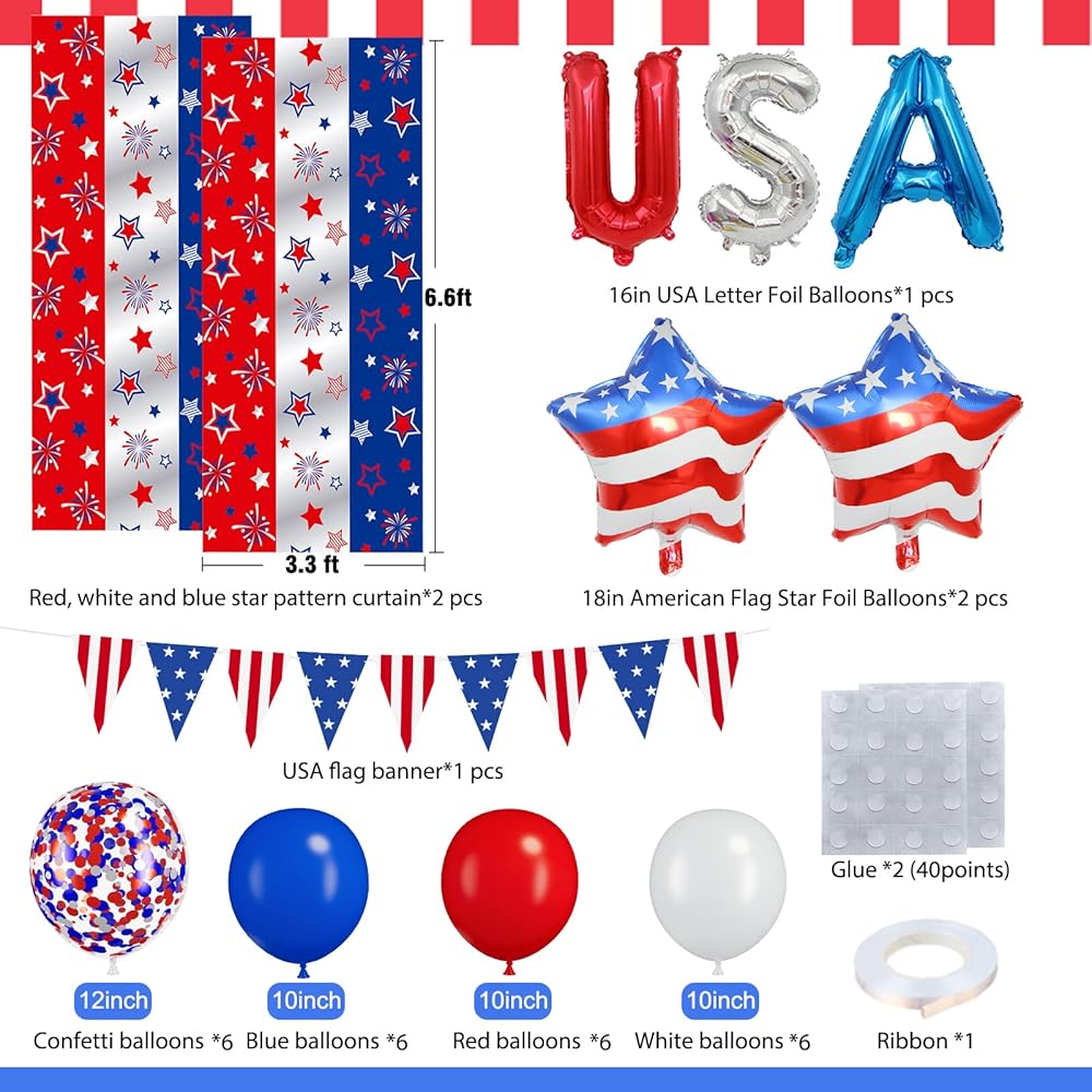 Package - You will get 2 pack foil fringe curtains,24pcs red white blue latex balloon,letter USA,USA flag pennant*1, ribbon*1,point glue*20 . The fringe curtains size (width x drop):3.28 x 6.56 ft each, wonderful patriotic party decoration backdrop curtain.