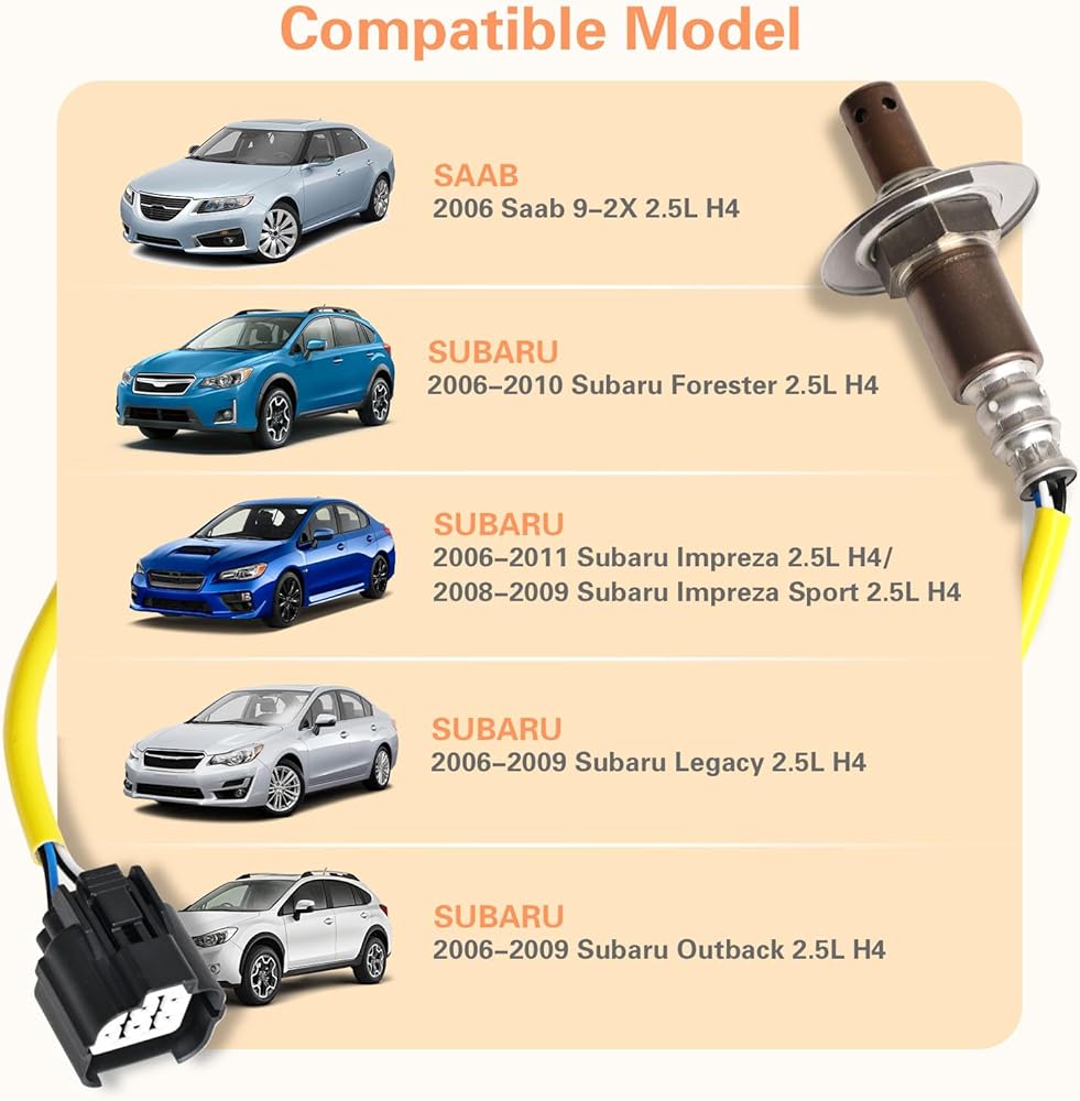 [Compatible Models] -Nifeida oxygen sensor 234-9123 upstream direct fit for 2006-2010 Forester H4-2.5L; 2006-2009 Legacy 2.5i H4-2.5L, 2006-2009 Outback 2.5i H4-2.5L, 2006-2011 Impreza H4-2.5L, 2008-2009 Impreza Sport 2.5L, 2008-2011 Impreza Outback Sport 2.5L, Saab 2006 9-2X 2.5L.