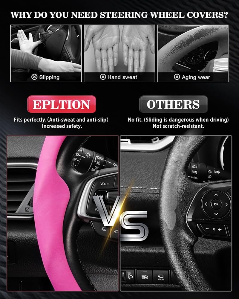 High-quality Material --- Epltion steering wheel cover is made of high-quality leather, no smell, comfortable touch, non-slip and wear-resistant, ultra-thin fit, suitable for all seasons. Steering wheel covers not only help you hide existing wear and tear, but also provide your steering wheel a new look.