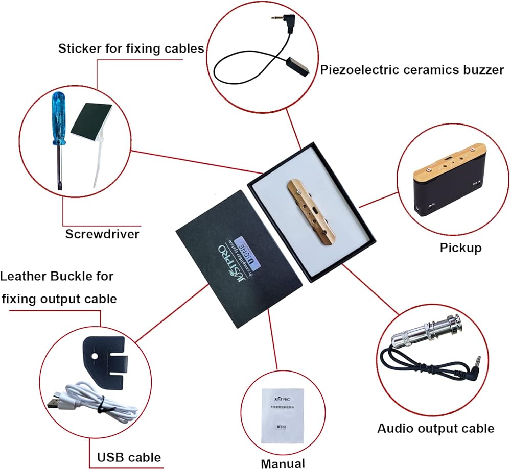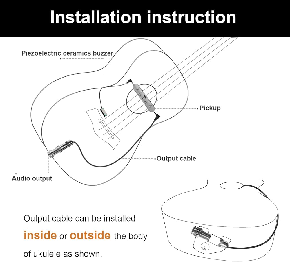 Piezoelectric Dual-System - Piezoelectric ceramics buzzer of the pickup for ukulele helps to highly reproduce the audio, avoiding external interference and making the sound with higher sensitivity.