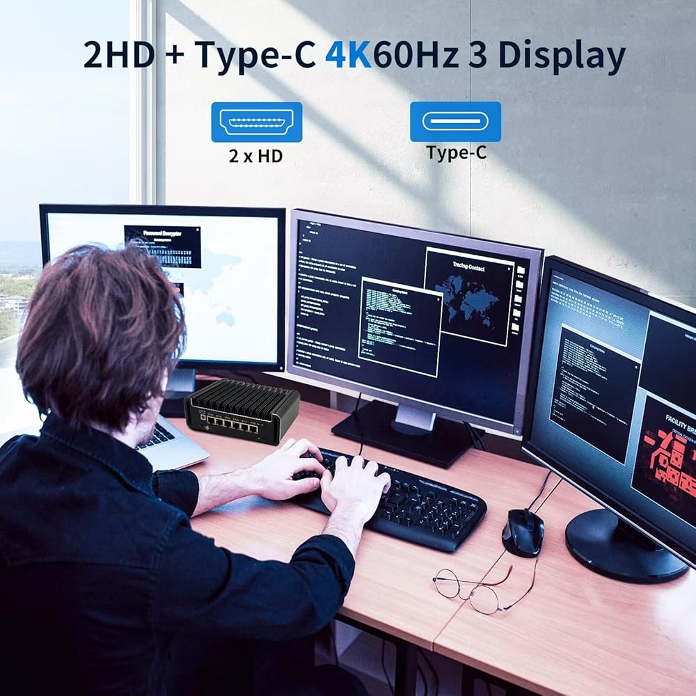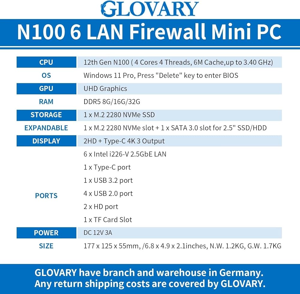 【12th Gen Alder Lake N100】GLOVARY firewall hardware with Alder Lake-N 12th Gen N100 Processor, 4 Cores 4 Threads, 6M Cache, Max Turbo Frequency 3.4 GHz, TDP 6W. Integrated UHD graphics with 2HD+Type-C triple display support 4K@60Hz. Windows 11 Pro system installed by default, supports OPNsense, Linux, ESXI, OpenWrt, etc. Tap "Delete" key to enter BIOS setup, AMI EFI BIOS supports Auto Power On, GPIO, PXE.