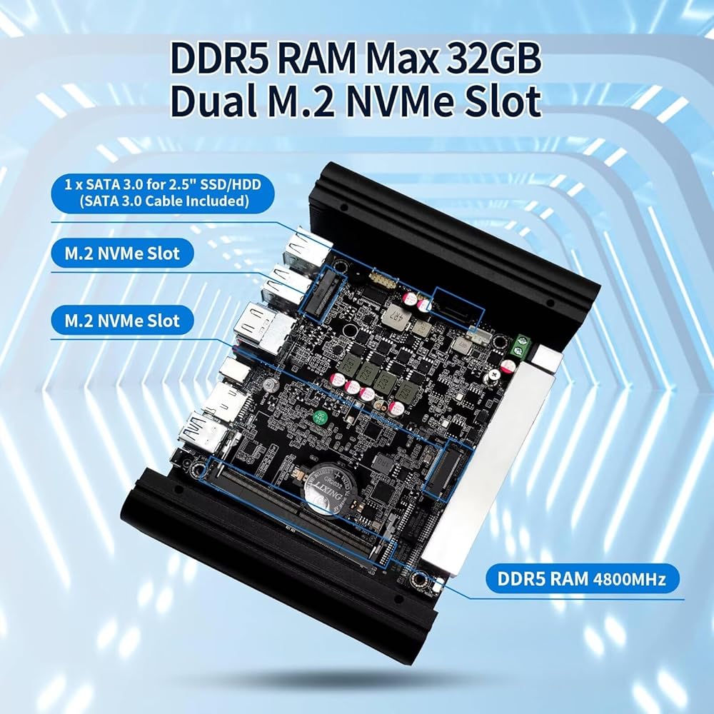 【DDR5 RAM & Dual M.2 NVMe Slot】Tiny hardware firewall with 1 x DDR5 SO-DIMM memory 4800MHz compatible with 5200/5600MHz, 2 x M.2 2280 NVMe SSD slot, 1 x SATA 3.0 for 2.5" SSD/HDD (SATA 3.0 Cable Included).