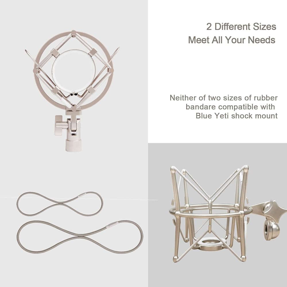 ◮ Universal for most shock mounts - Package comes with 4 pieces of elastic bands, which can be applicable for most types of shock mounts. (Two sizes of elastic bands are not suitable for Blue Yeti shock mount!!)