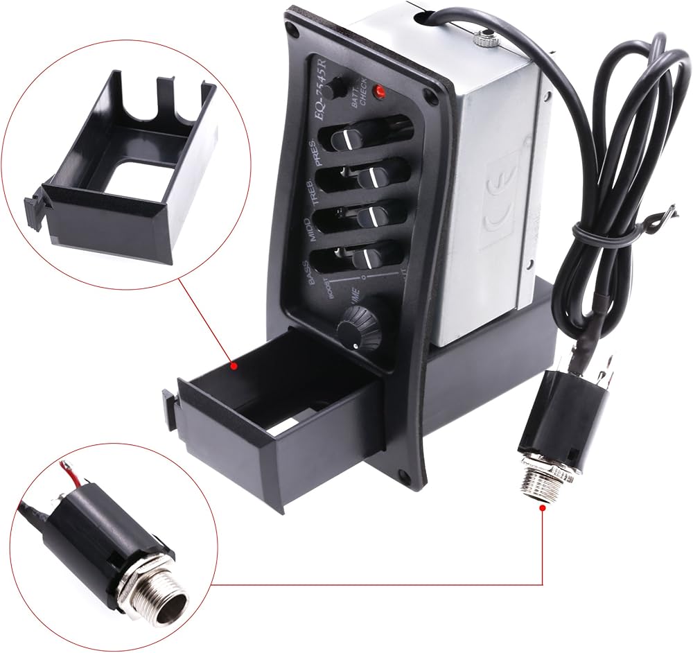 For standard acoustic guitars, this Curve pre-amp gives you an on-board equalizer and volume control and helps boost and clarify the signal before it goes to your amplifier. For cigar box guitars, using a FLAT pre-amp is guaranteed to make your CBG sound better, compared to wiring a piezo straight to a jack.