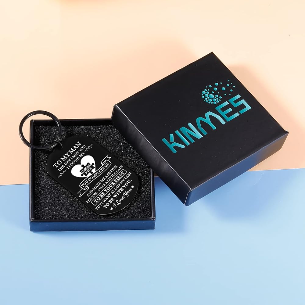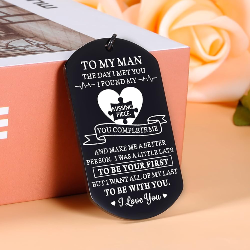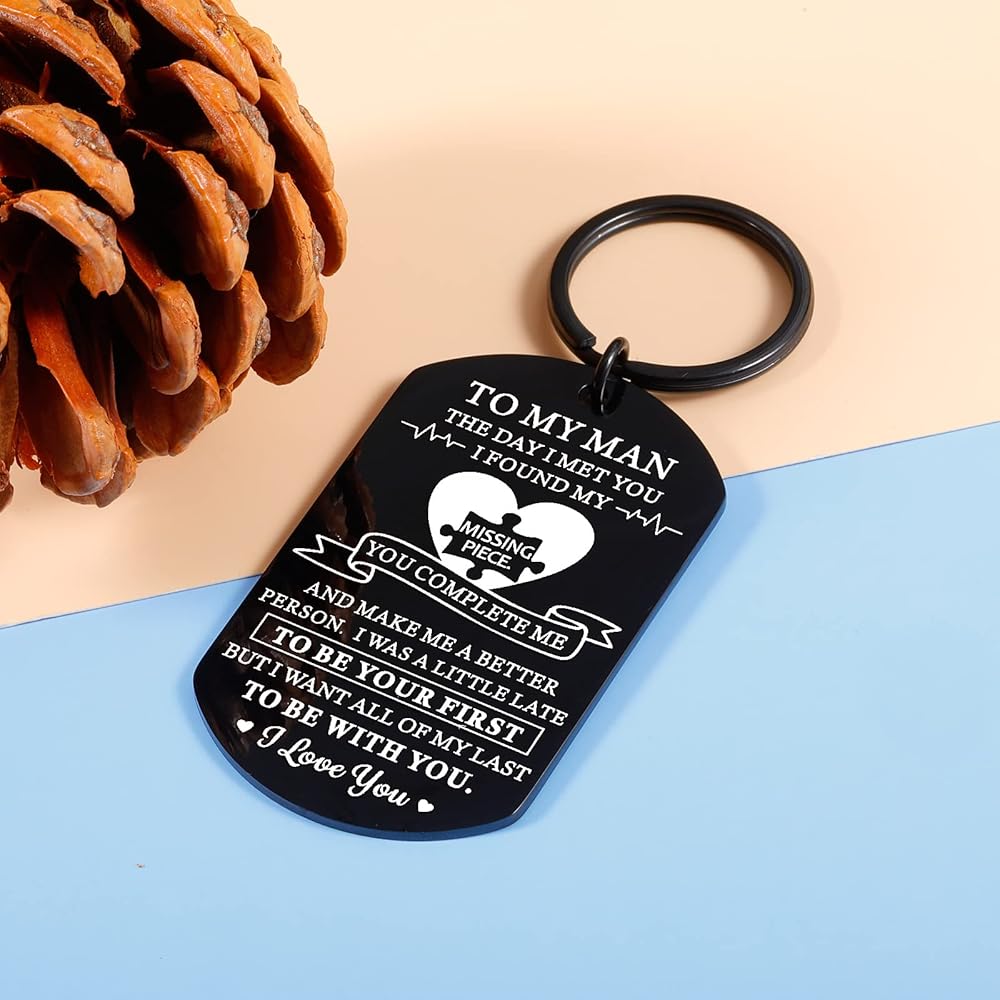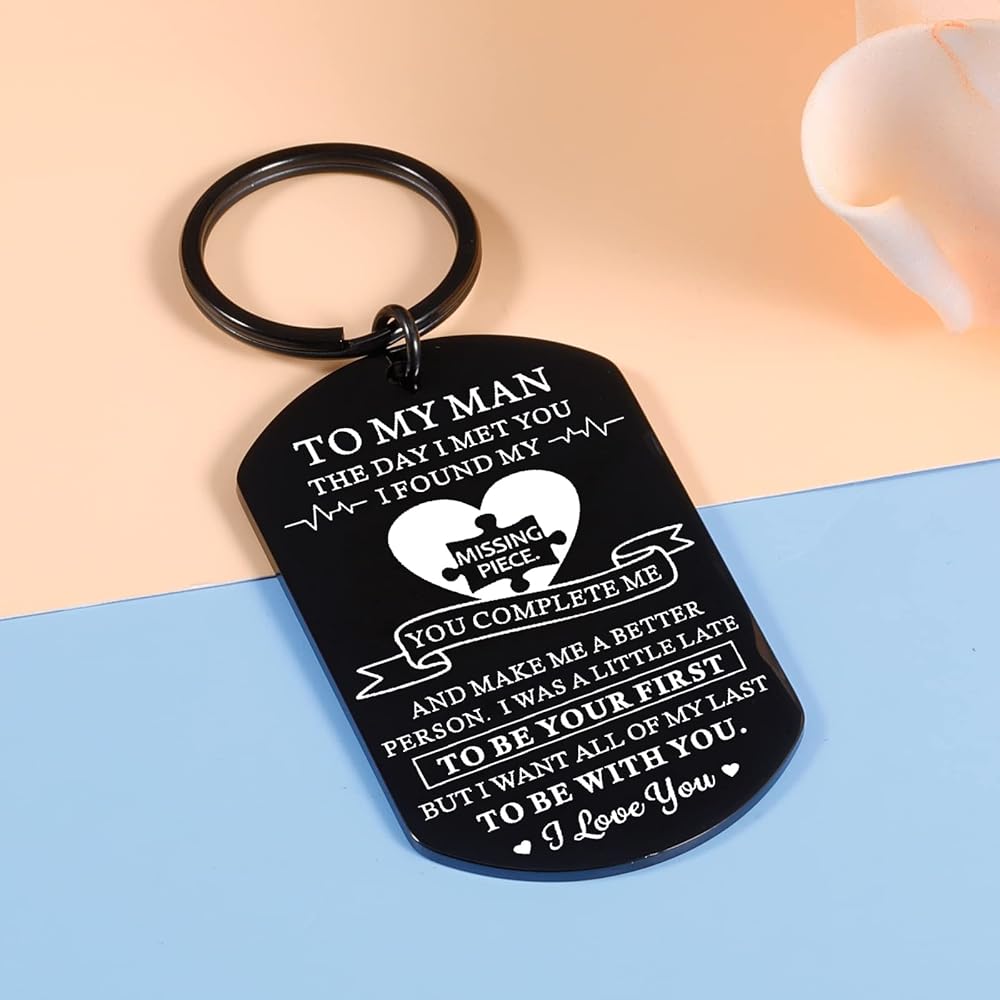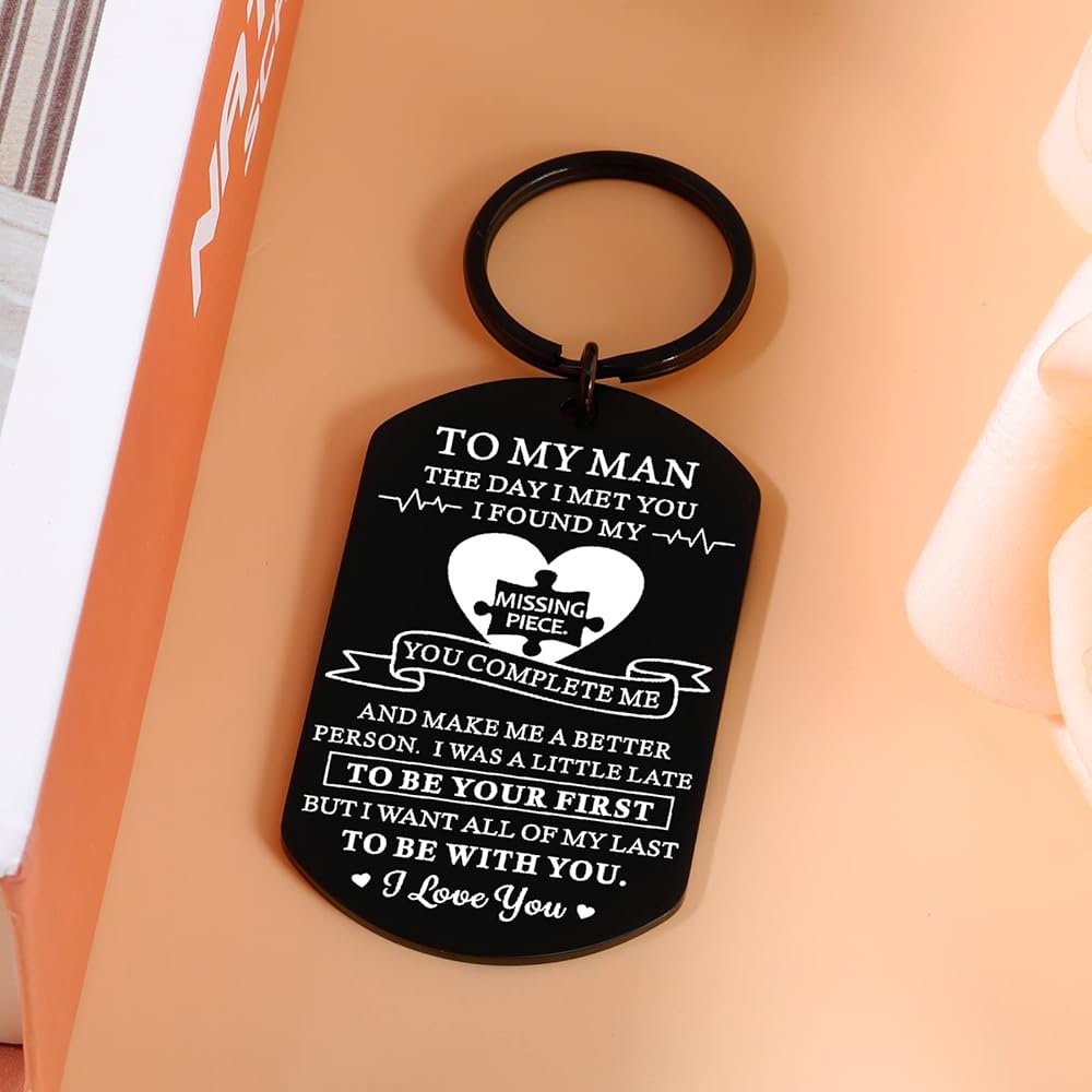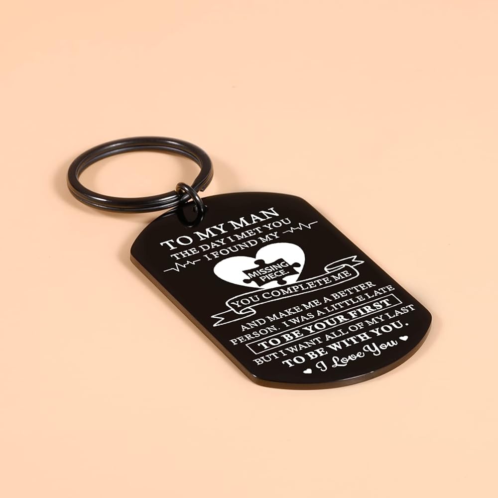 • Gifts for Men Valentines Day: This cute keychain reads: To my man the day I meet you I found my missing piece. You complete me and make me a better person. I was a little late to be your first but I want all of my last to be with you. I Love You. Perfect for deployment, military, bday, engagement, wedding, graduation, Easter, Thanksgiving, Christmas, religious events, National Boyfriend's Day, and Spouse's Day. Or just because.