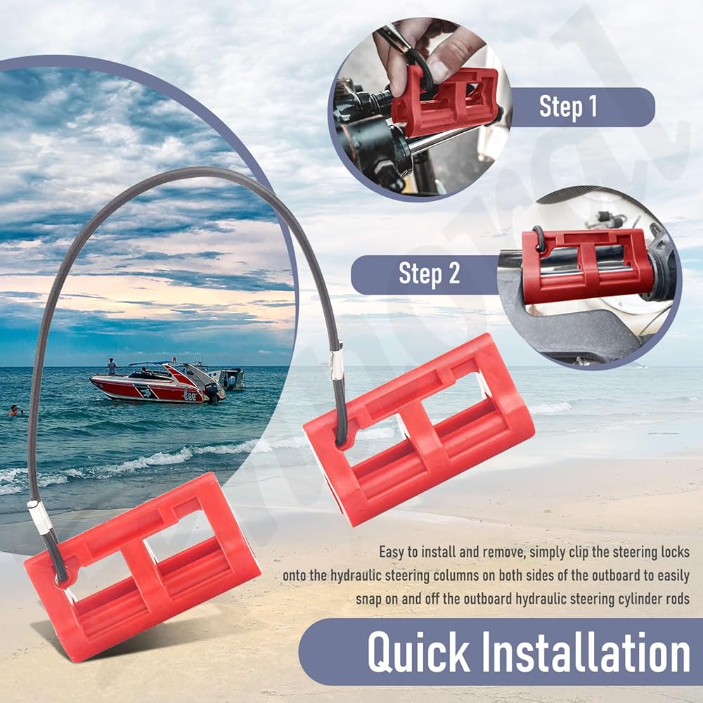 Easy to install and remove, simply clip the steering locks onto the hydraulic steering columns on both sides of the outboard to easily snap on and off the outboard hydraulic steering cylinder rods.