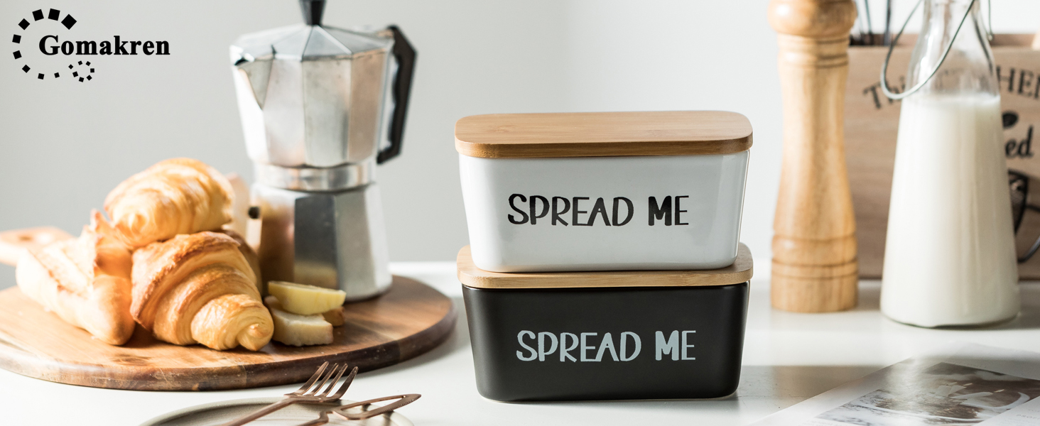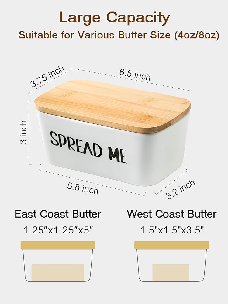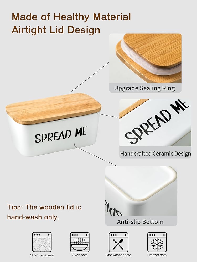 Made of Food-grade Material - This covered butter dish is made of healthy and reliable ceramic and the lid is made of high-quality natural wood which is safer and long-lasting. Tips: The wooden lid is made of natural wood which is HAND-WASH ONLY. But the ceramic container is dishwasher safe.