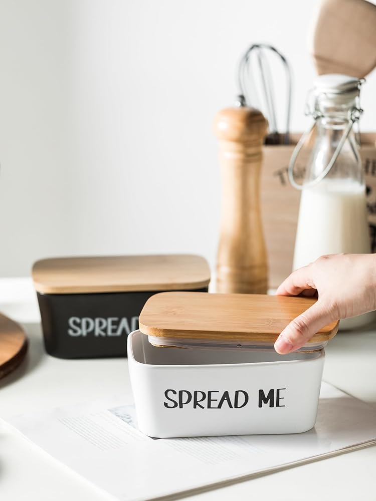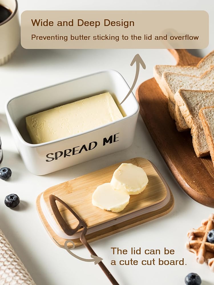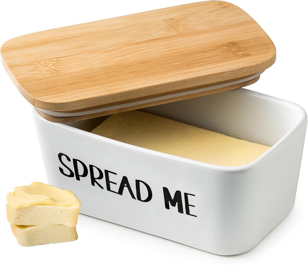 Kitchen Decor and Gifts Ideal - The white butter dish looks funny on butter lovers' kitchen counter and everyone knows it's butter in there because of the design and the print on the side "SPREAD ME". It is also a perfect gift for your family and friends!