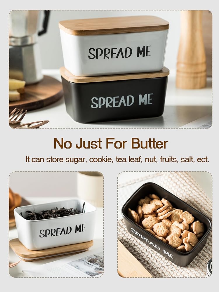 Not Only a Butter Container - This butter holder not only can store butter but also can be used to keep cream cheese, dips, etc fresh. You can also use it to store salt, sugar, cookies, snacks, nuts, fruits, spices, etc. And the wooden lid also doubles as a mini cutting board!