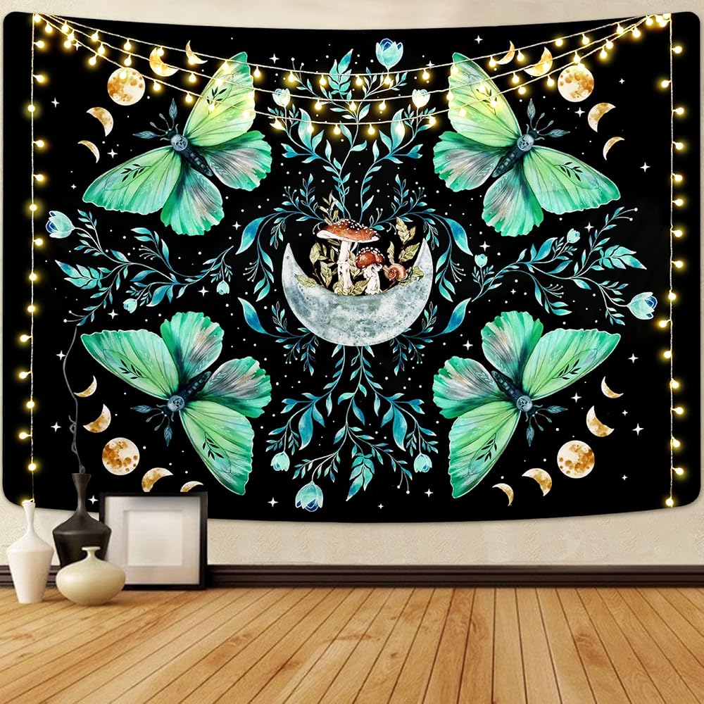 UNIQUE DESIGN: This moon tapestry features aesthetic elements such as beautifully moths, moons, mushrooms and botanical flowers, embellishing moon phases and stars, which is the great way to brighten up your space.