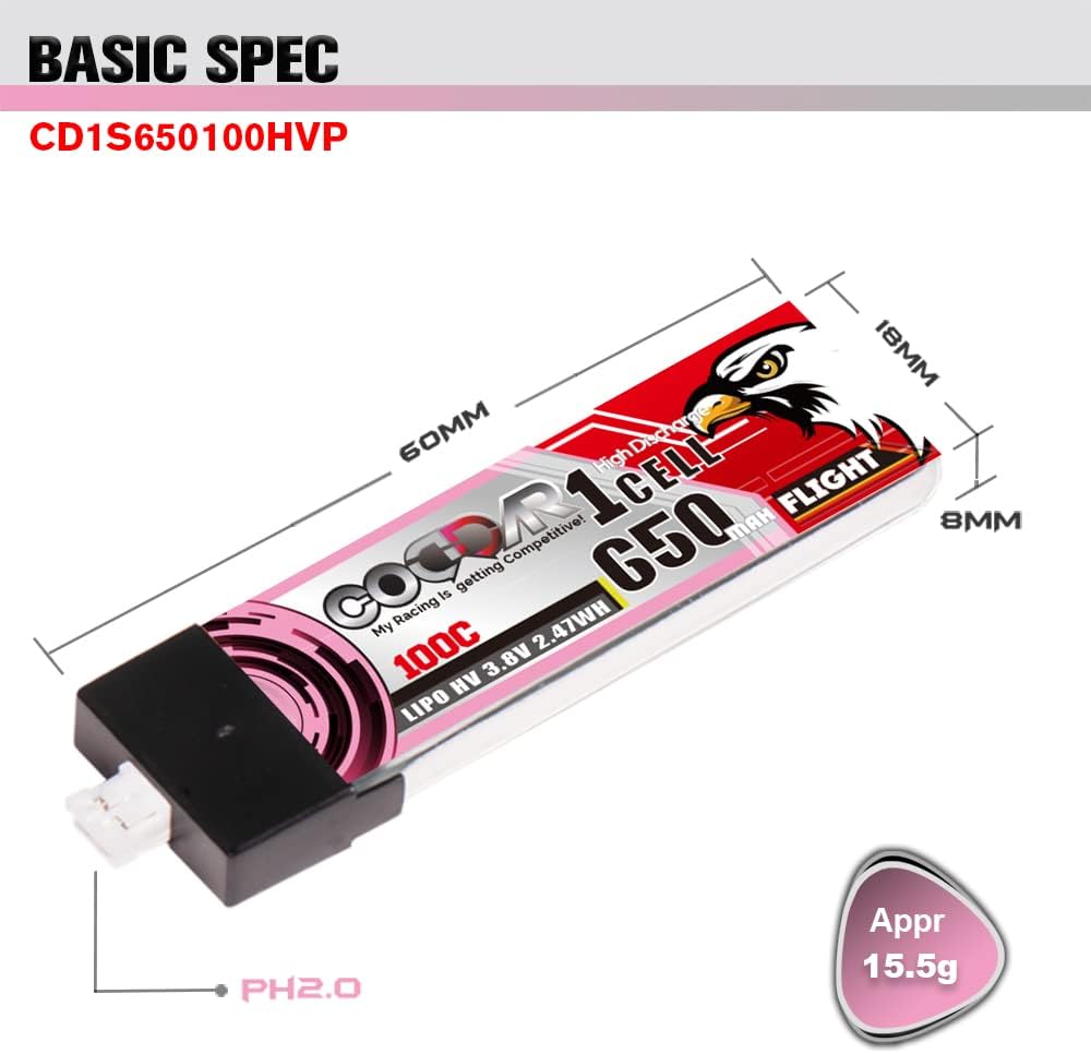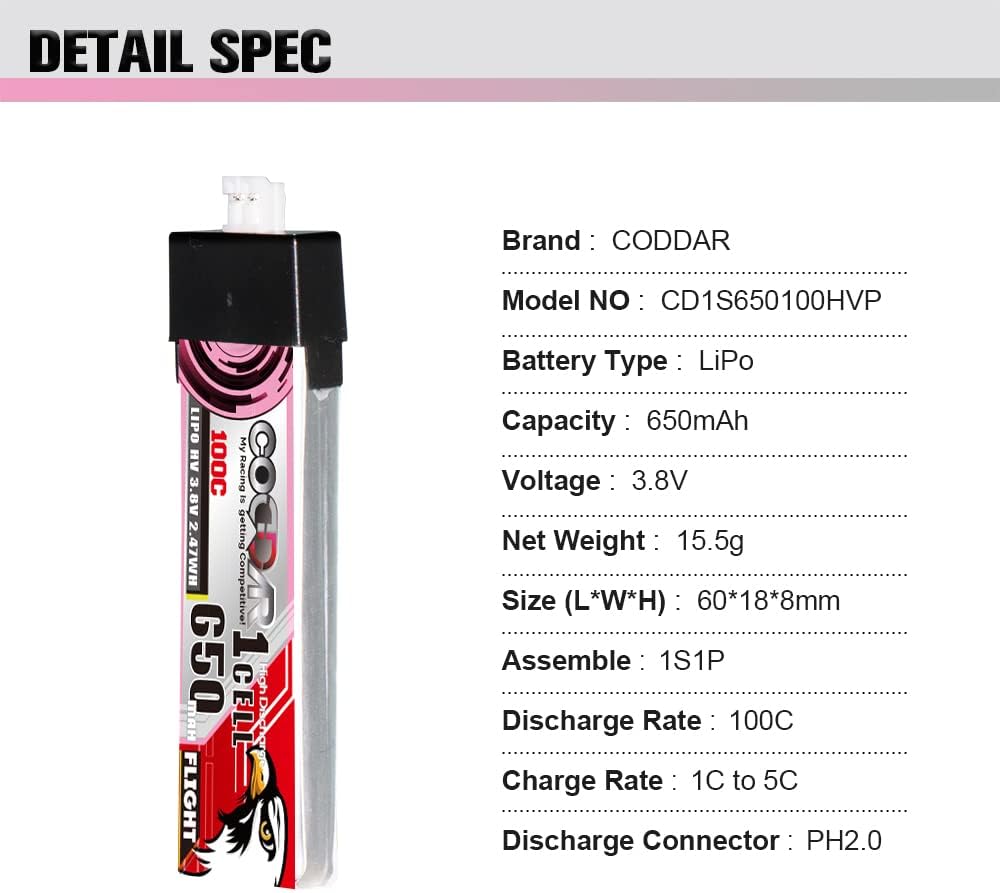• Specifications: CODDAR 650mAh 1S 3.8V 100C LiPo with JST-PH 2.0 and XH-JST balance Connector, Dimension 60(L)*18(W)*8(H)mm, Approximately Weight 15g