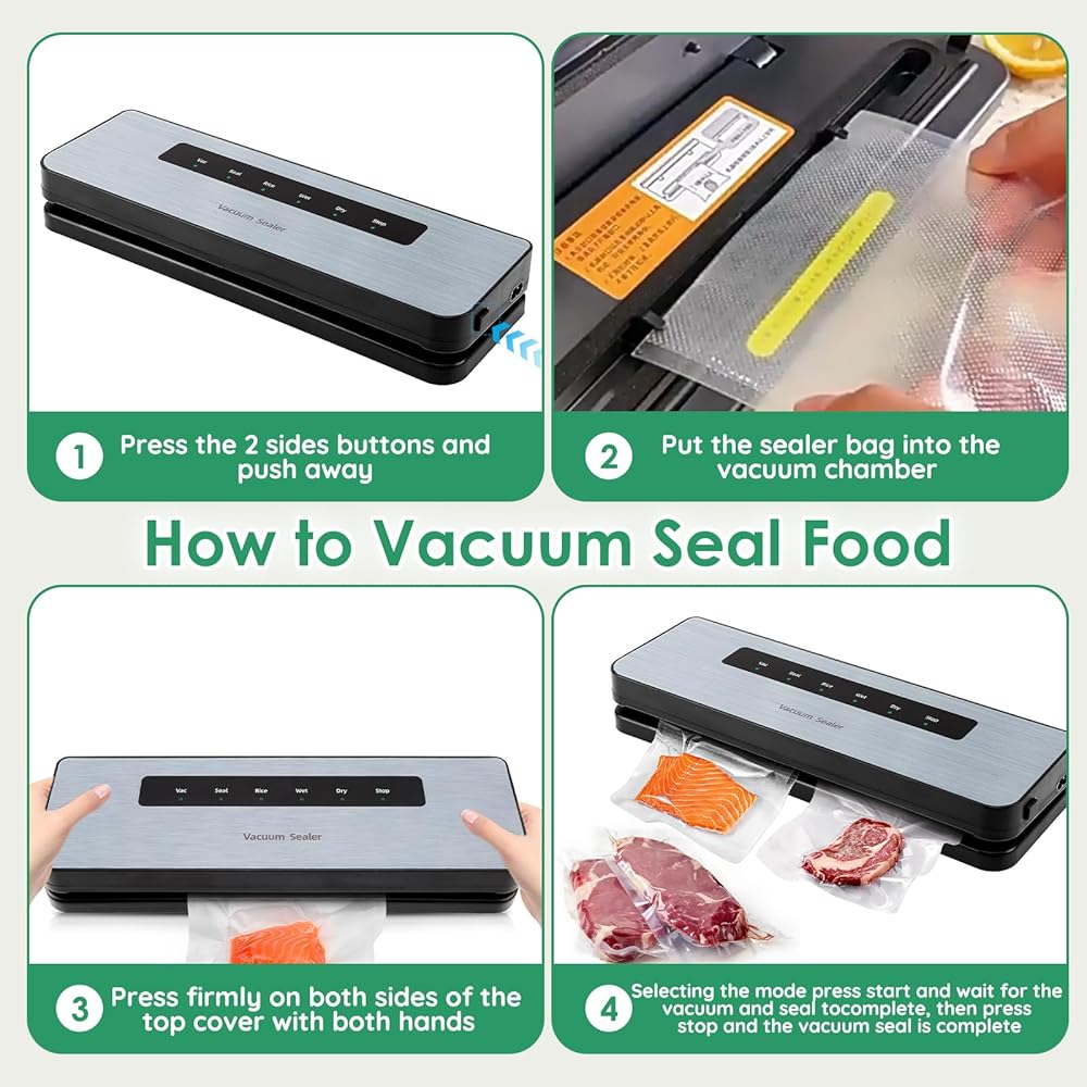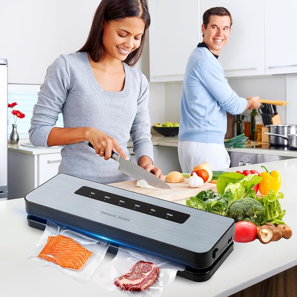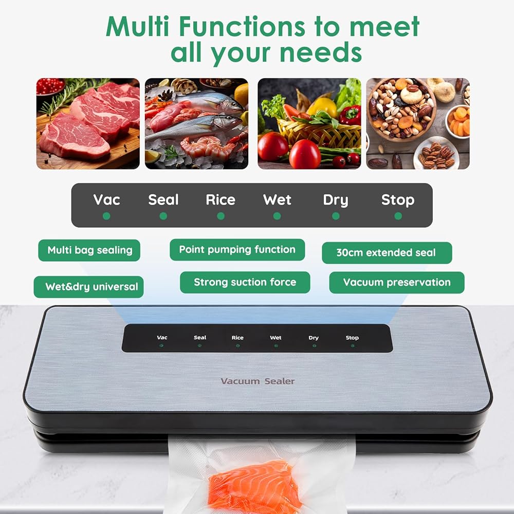 The ideal money and time saving solution: Owning this food vacuum sealer can make food storage in the kitchen simpler, Cooking and meal preparation will become easier, less expensive and faster, as you will be able to equip and organize your freezer, with fresh food ready to be defrosted and served or fresh ingredients instead of freezer burned food filled with ice crystals which will probably end up in the trash can.