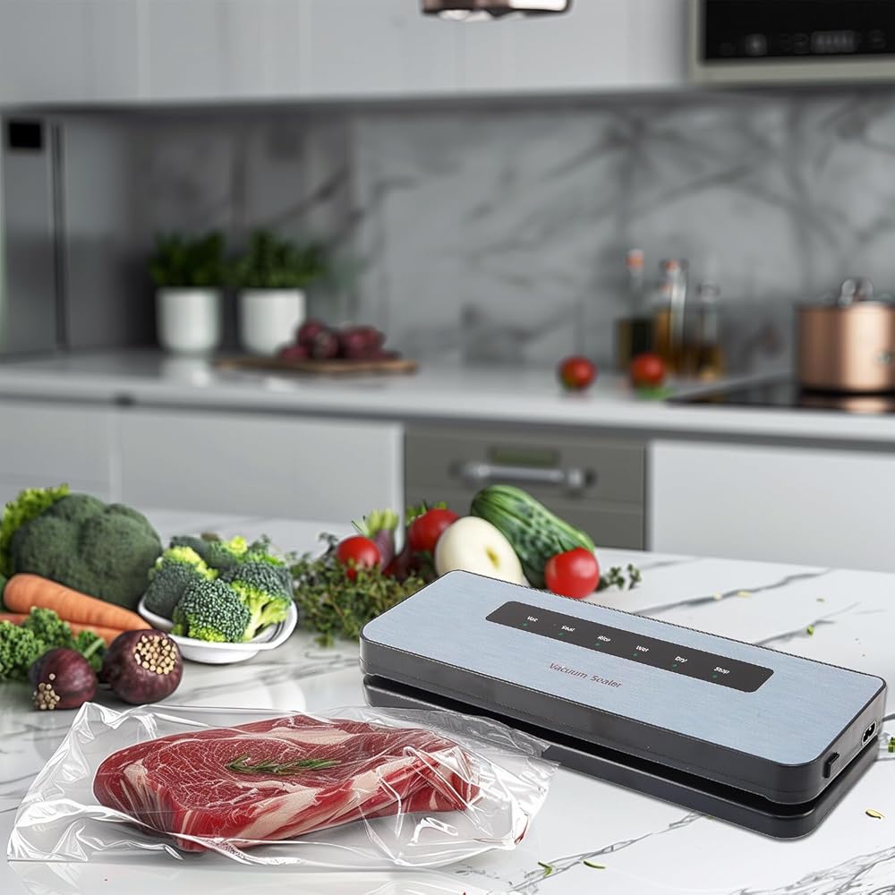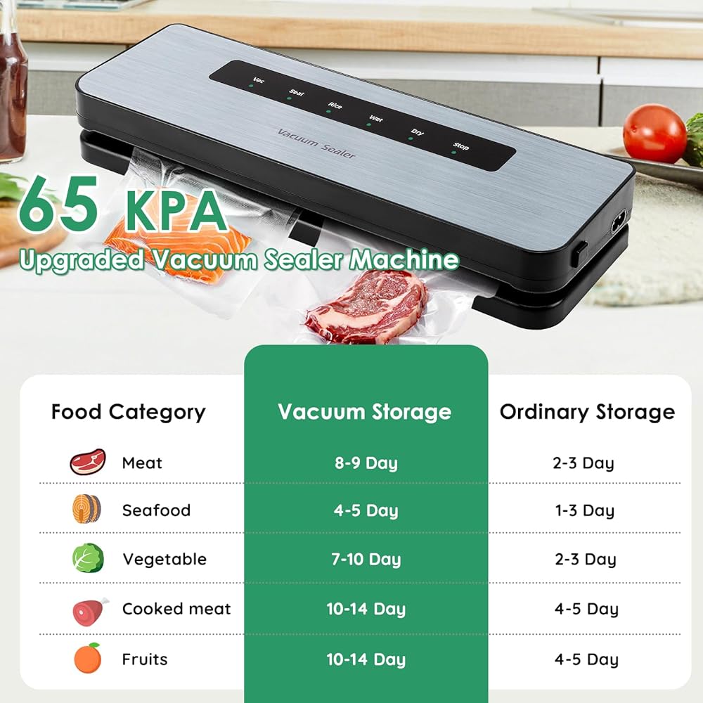 Vacuum Sealer: Automatic vacuum sealing machine with stylish design, Perfectly suited to contemporary design aesthetics, Produces 65KPa strong suction to remove air from bags, keeping food fresh longer than normal storage.