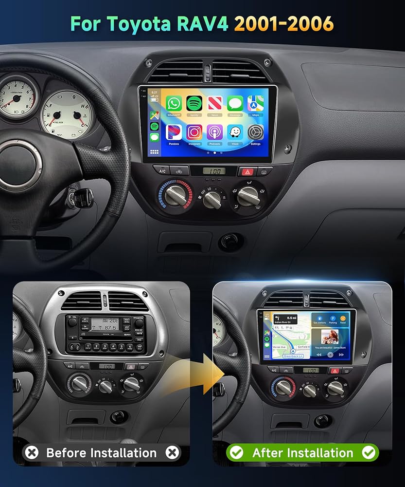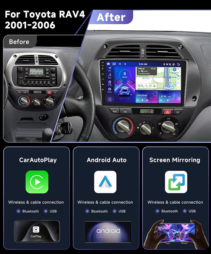 🚗【Stereo Configuration & Car Compatibility】Perfectly compatible with Toyota RAV4 2001 2002 2003 2004 2005 2006 without additional accessories.Features newest Android system, 9 inch 2.5D 1080P HD vertical touch screen, 2G RAM+64G ROM, offline/online GPS navigation, Wi-Fi, RDS/FM radio, two USB, 16 EQ settings, built-in Hi-Fi audio, waterproof HD rear view camera, and steering wheel control of original car.