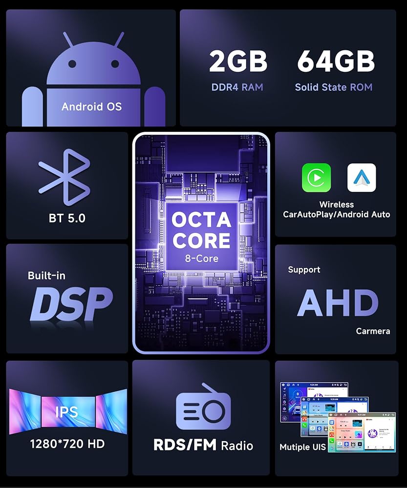 🚙【Carplay & Android Auto & MirrorLink】Wireless Apple CarPlay and Android Auto offer a familiar, user-friendly interface for seamless integration between your phone and car's infotainment system. Make it simple to navigate through apps, music, and messages without distracting you from the road. Additionally, the system supports IOS/Android mirror link, allowing you to mirror your phone's screen on the radio's display and use your phone's apps, music, videos, and more.