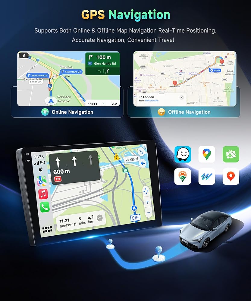 🚗【GPS & WiFi & Hands-Free Calling & FM Radio】Our car play radio built-in GPS receiver and WiFi connectivity, enabling both online and offline navigation, internet browsing, and access to various applications such as GPS Maps, YouTube, TikTok, Spotify, and more. Stay connected while driving with incoming and outgoing calls, address book sync, and mobile phone music playback. Additionally, transmit music to your car stereo through FM and enjoy your favorite radio stations.